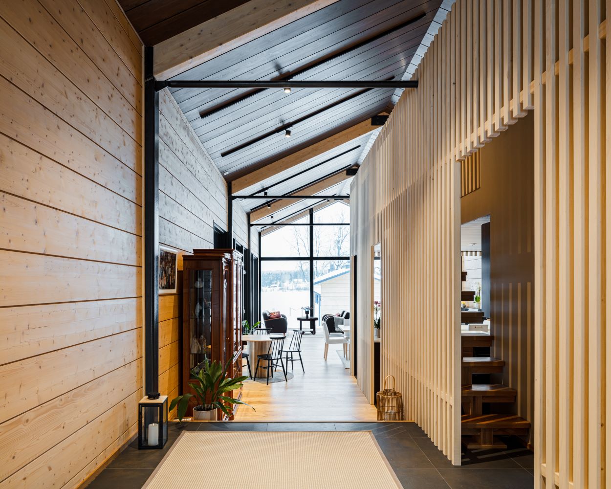 Rakennuspaikan loivaa rinnettä hyödynnettiin sijoittamalla oleskelutilat muutamaa askelmaa sisäänkäyntiä alemmaksi. Näin syntyy vaikuttava sisäänkäynti kohti jokimaisemaa.