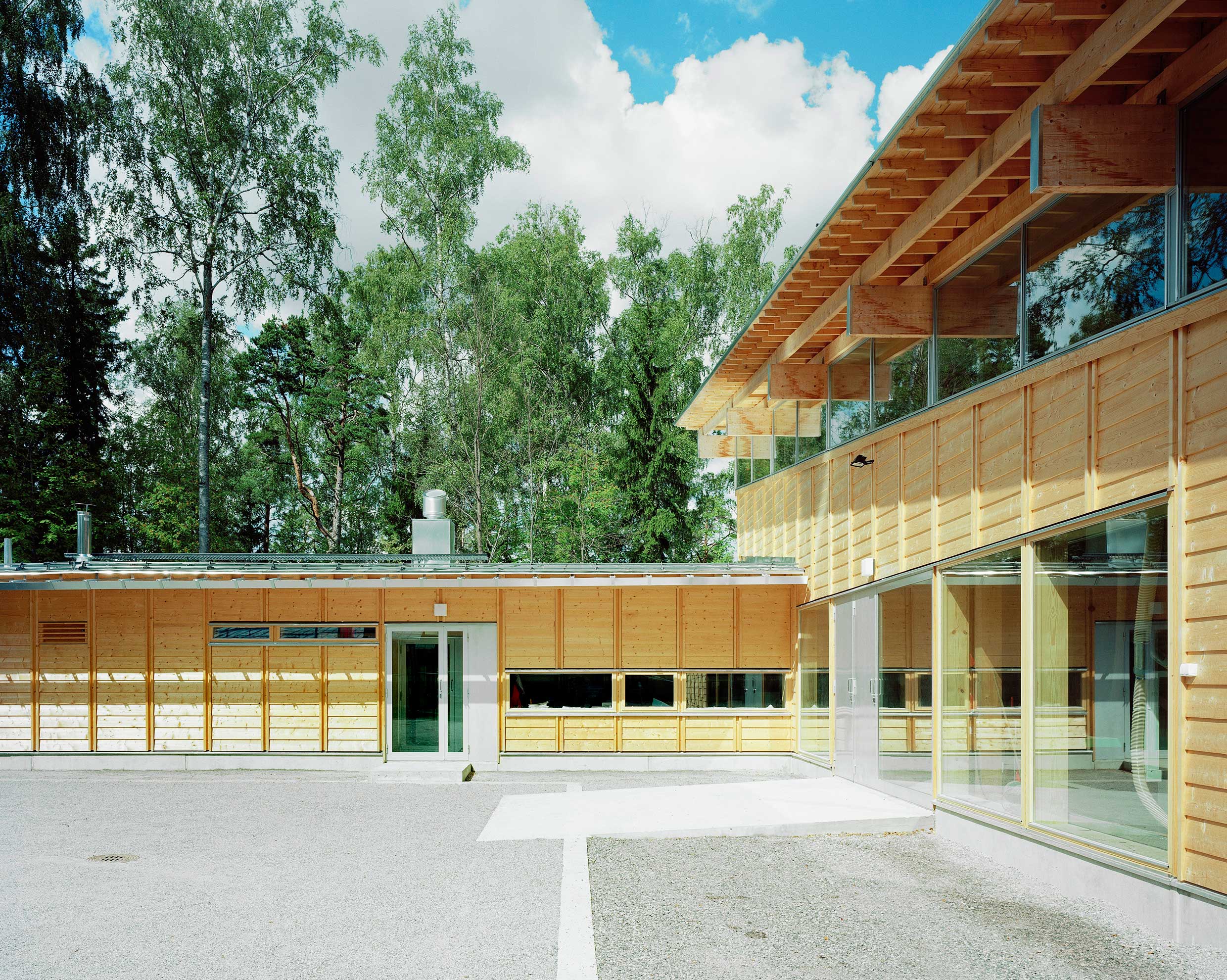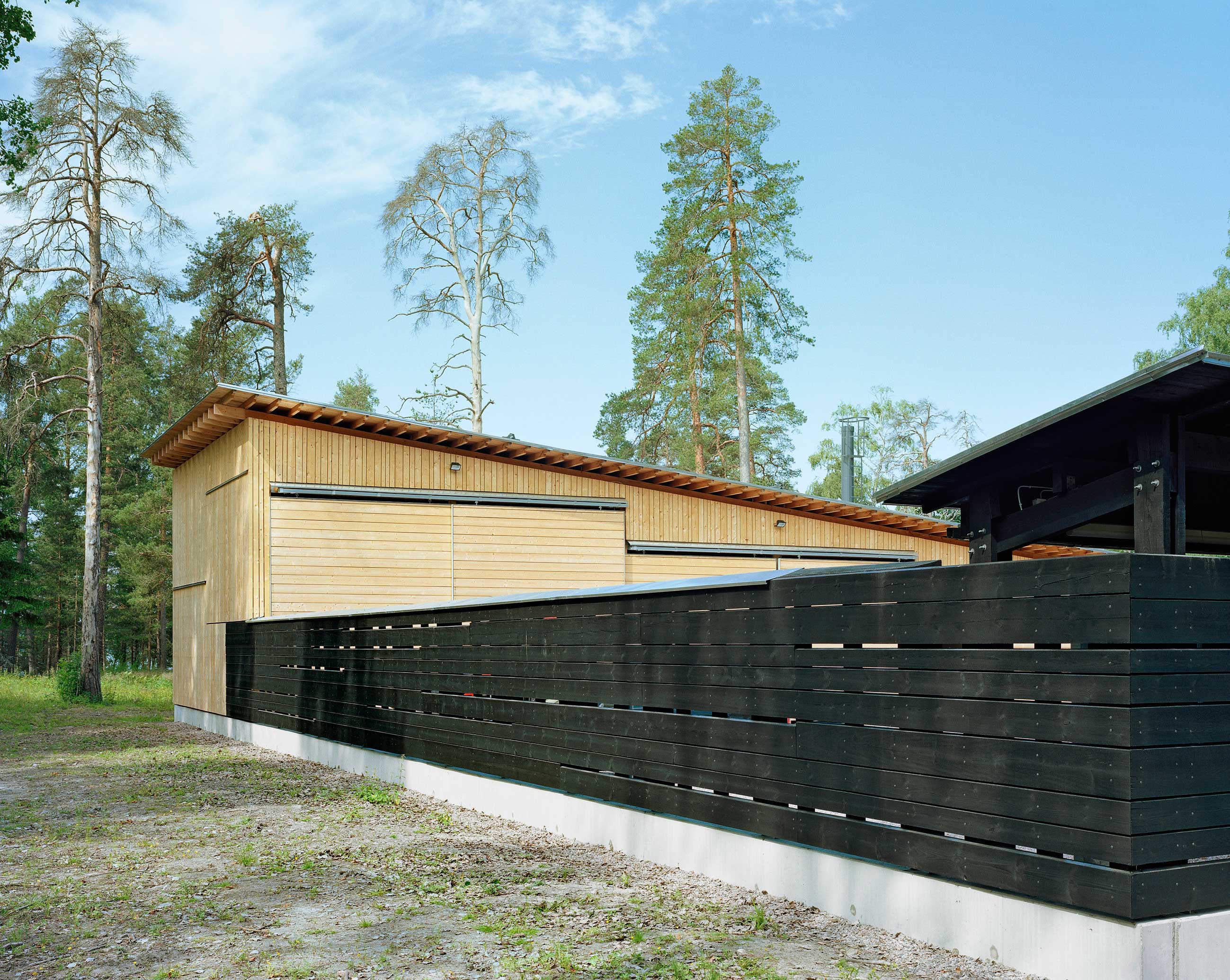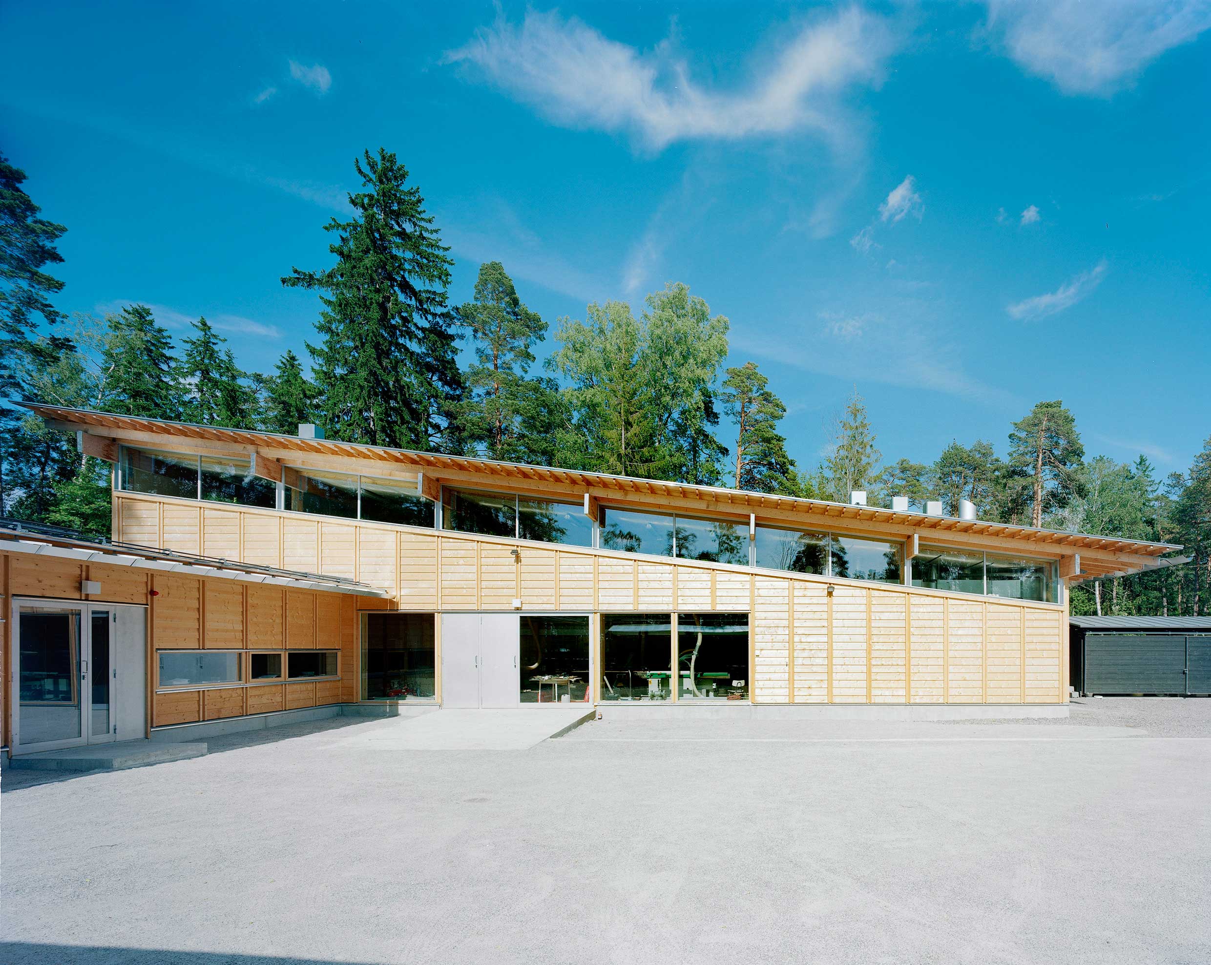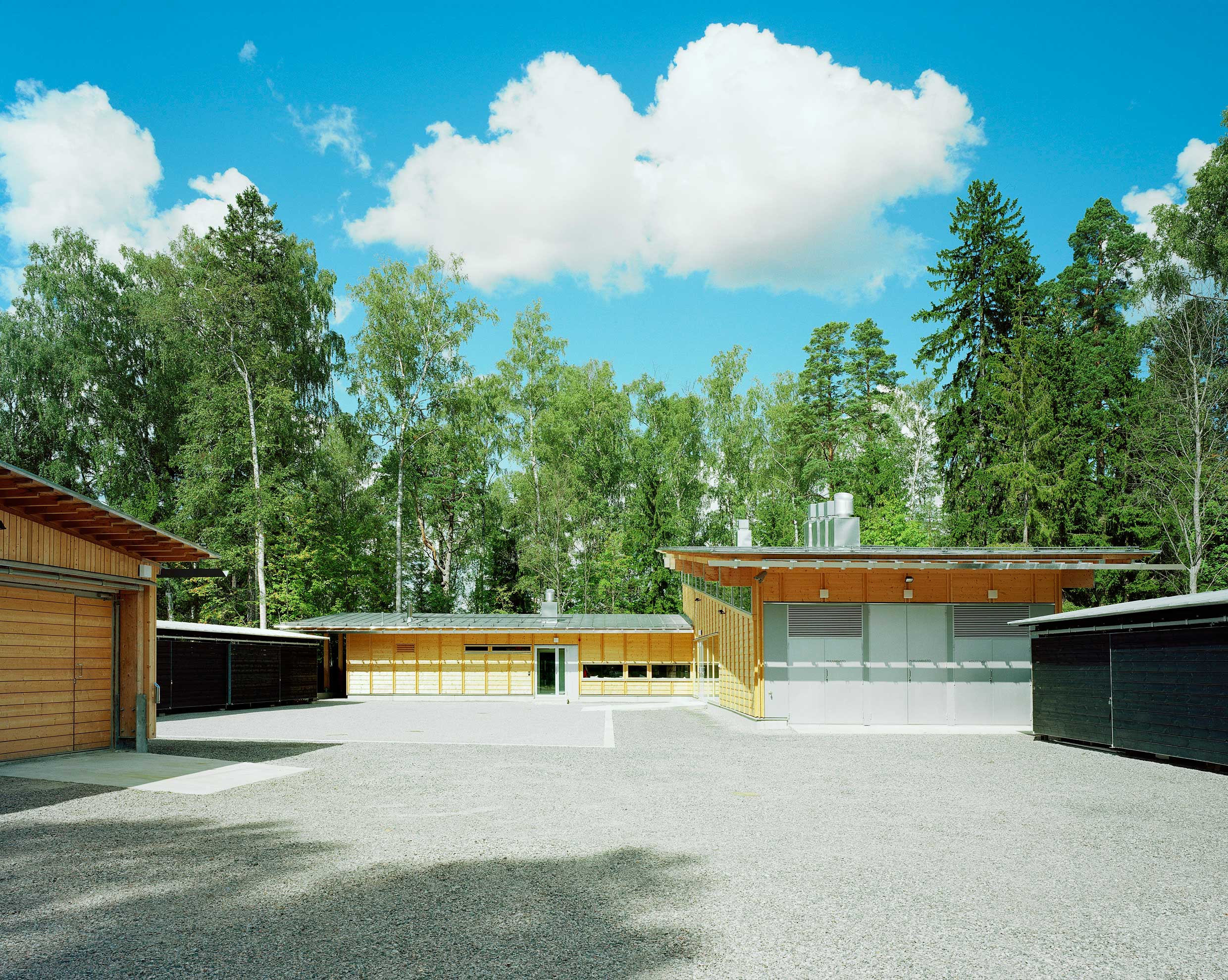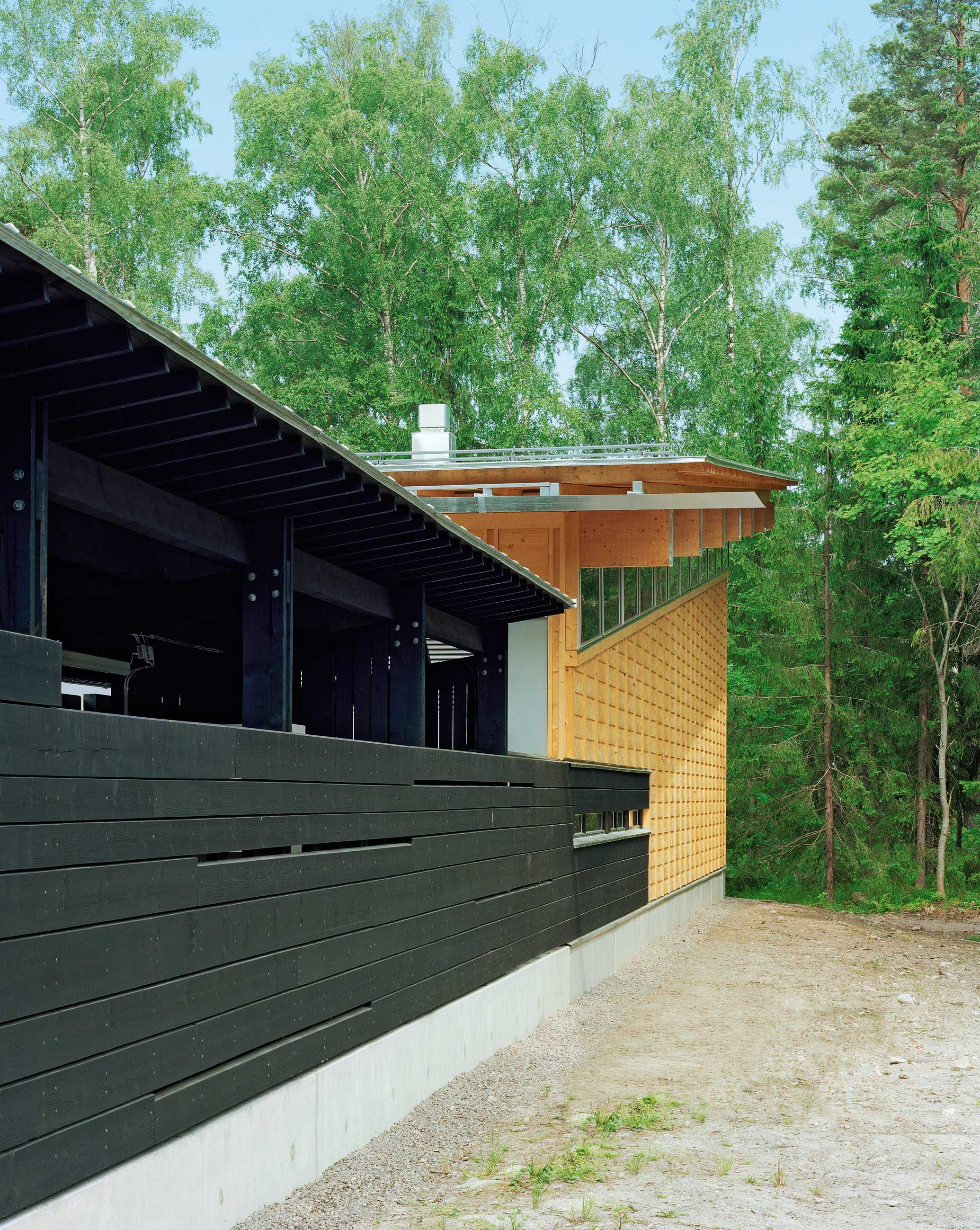 The idea for the building has been borrowed from the Antti farmstead at the Seurasaari Open-Air Museum, where the buildings and the fences linking them together form a sheltered farm-yard. Originally, the farm-yard provided protection against wild animals, but now it acts as an obstacle to vandalism and provides shelter for timber, machinery and vehicles.