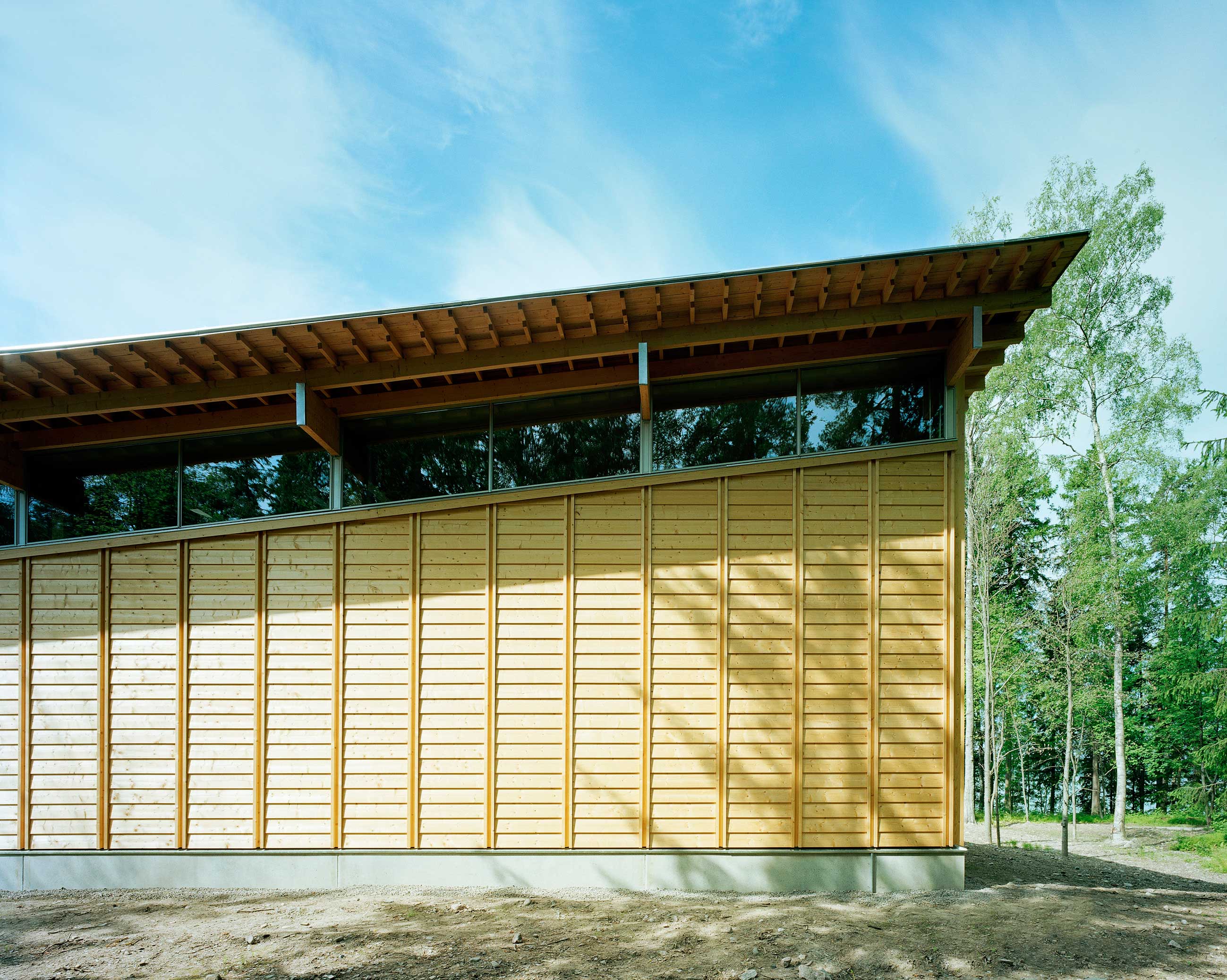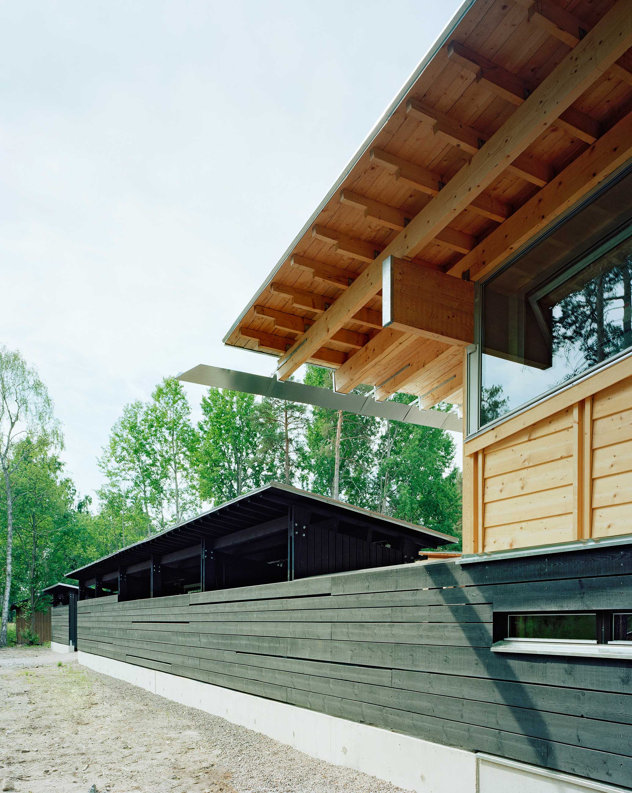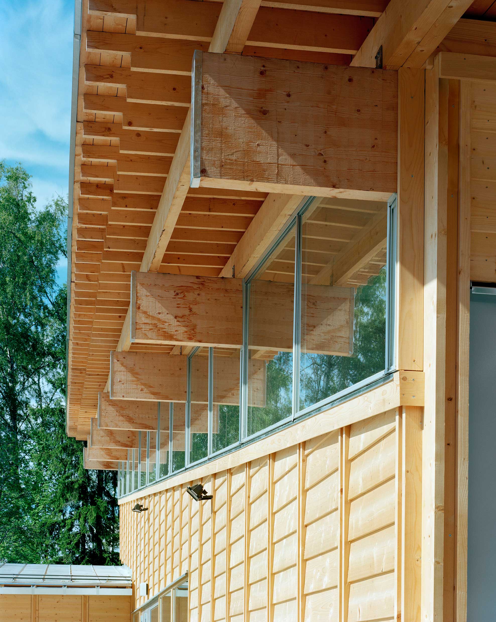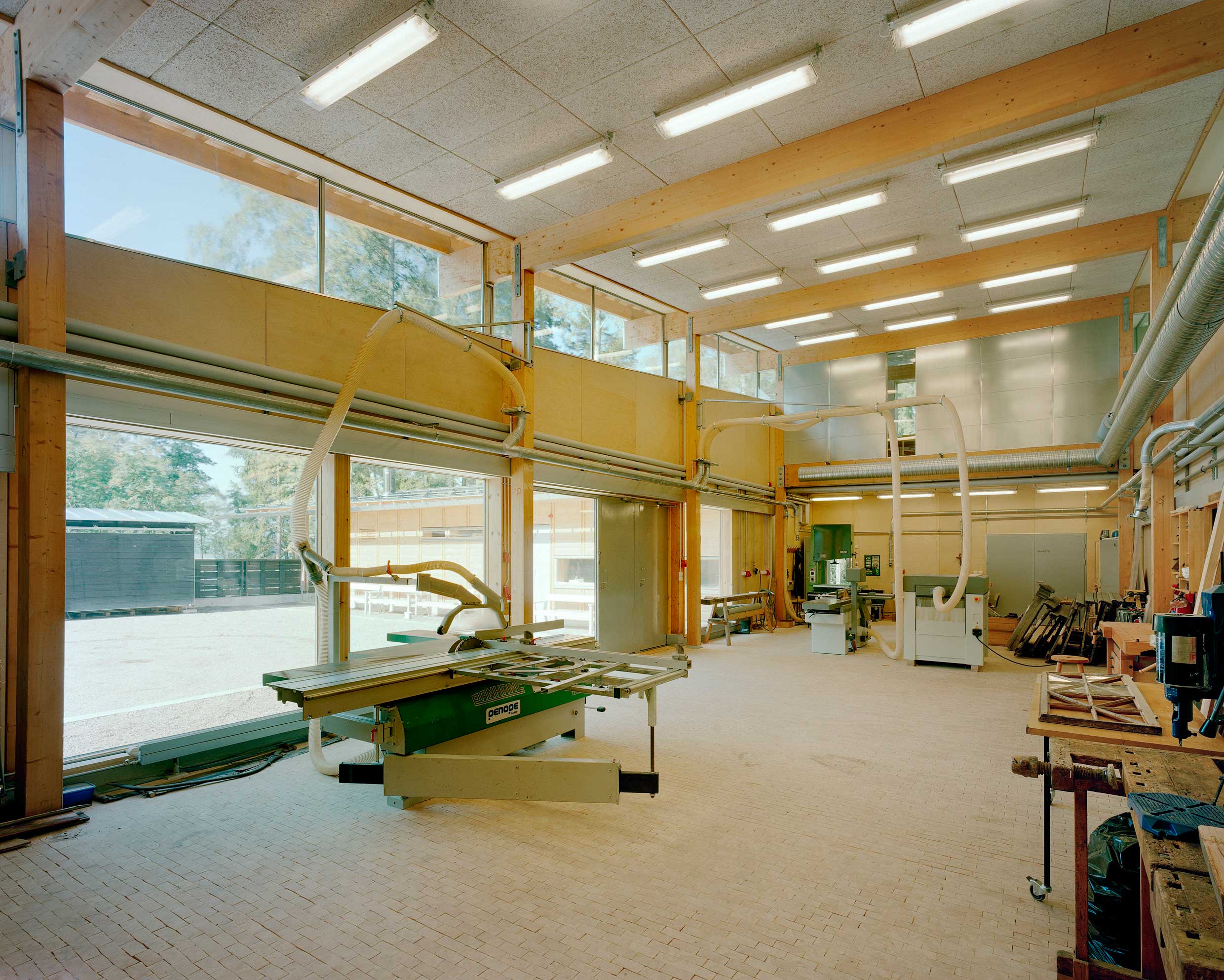 The roofs are long and mono-pitched, so that snow can be removed in a controlled manner. The load-bearing structure of the workshop building consists of solid-timber, double columns. The double columns are tied together and the space between is used for services. The roof is supported on laminated timber beams which extend outside the building to carry the eaves. The external walls are durable, easily maintained and renewable. The black-tarred pine boards cladding the storehouses contrast with the greyish coloured spruce surfaces of the main building.