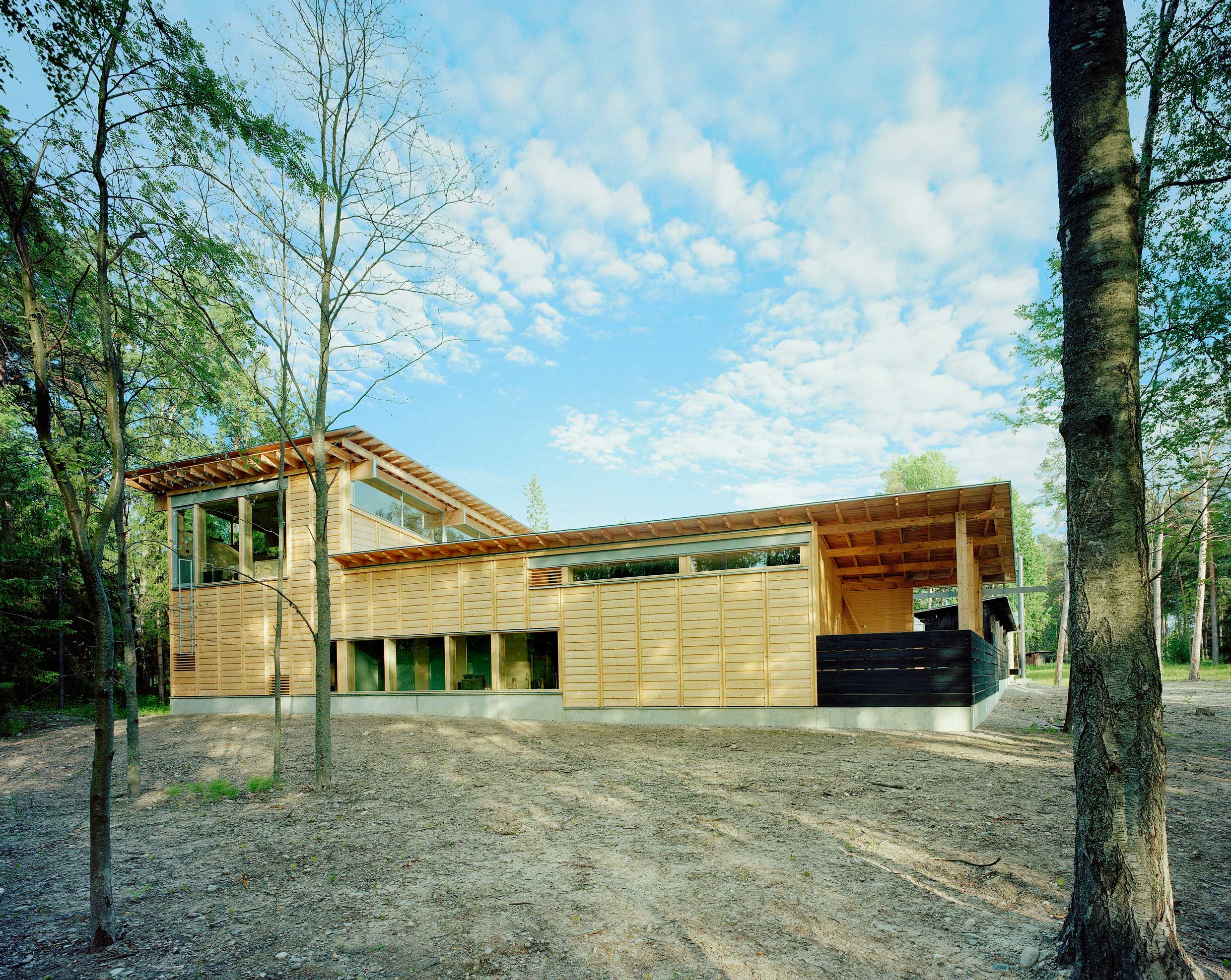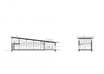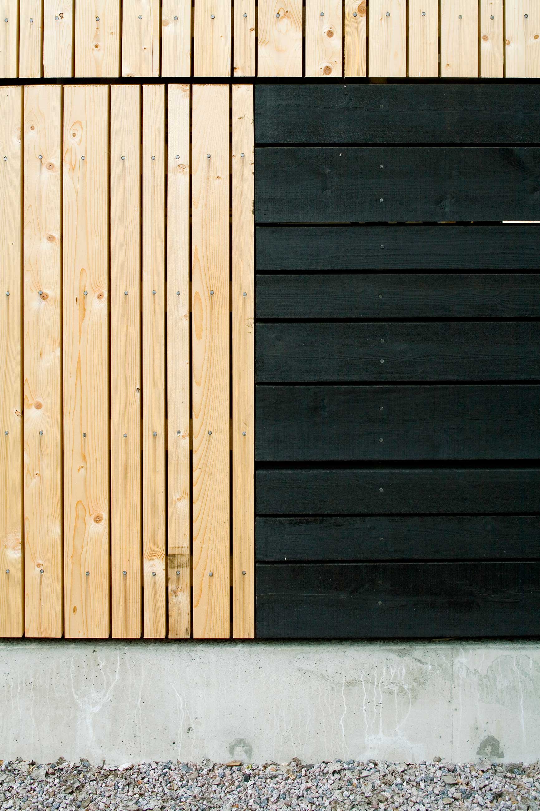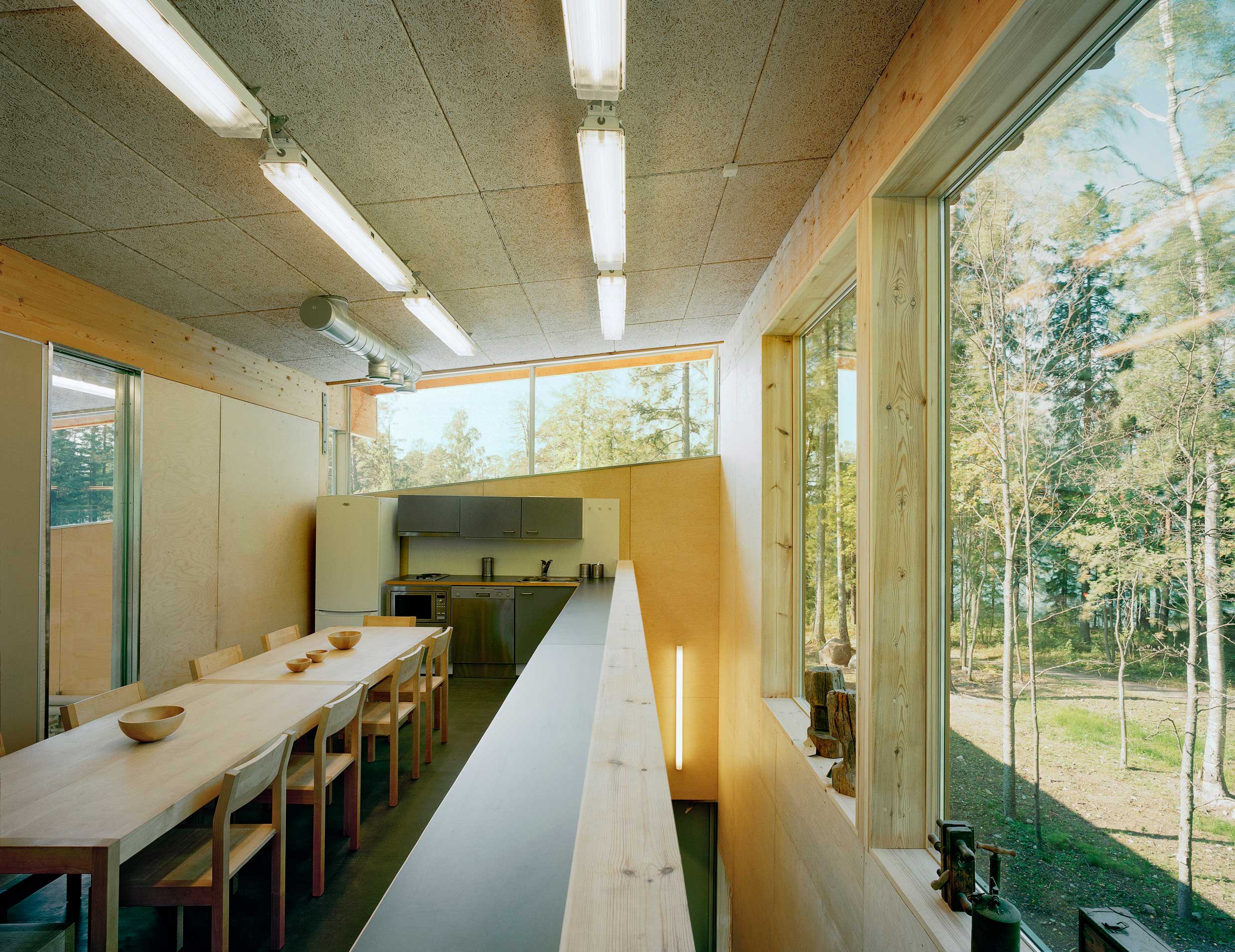 The roofs are long and mono-pitched, so that snow can be removed in a controlled manner. The load-bearing structure of the workshop building consists of solid-timber, double columns. The double columns are tied together and the space between is used for services. The roof is supported on laminated timber beams which extend outside the building to carry the eaves. The external walls are durable, easily maintained and renewable. The black-tarred pine boards cladding the storehouses contrast with the greyish coloured spruce surfaces of the main building.