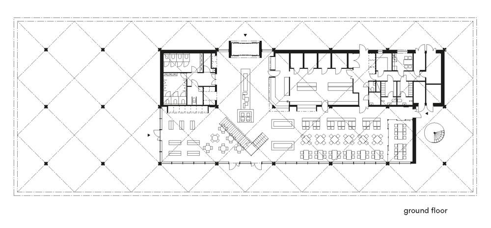 The Main Building, a buffer between traffic and nature, is comprised of 24 tree-like columns placed on an 8m x 8m grid. The columns give visitors the feeling of being in a forest. They carry a huge canopy that curves upwards towards the road as if to catch the attention of the passing motorists. The canopy provides shelter for both the fueling area and the pedestrian area around the building.