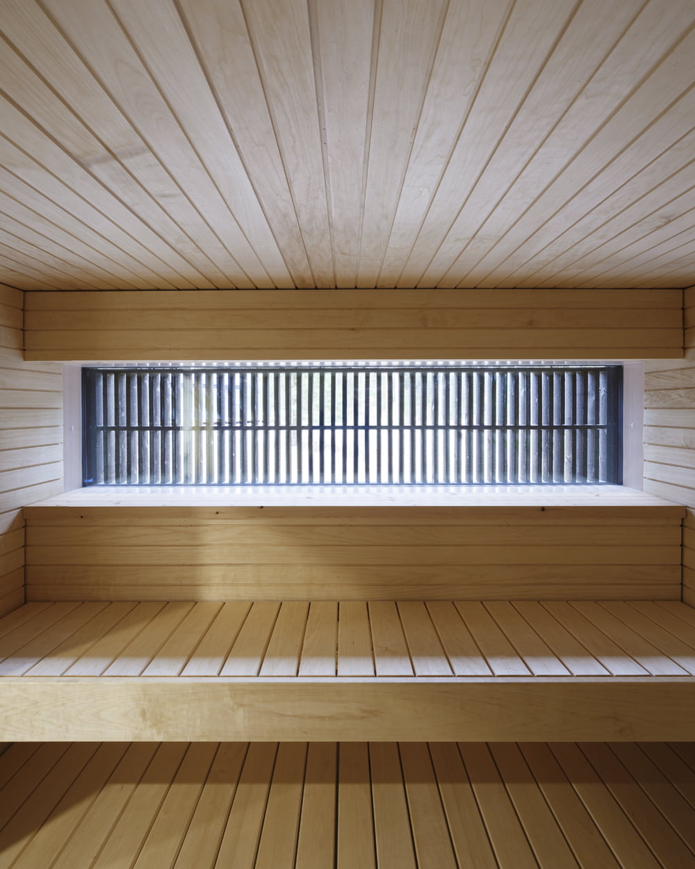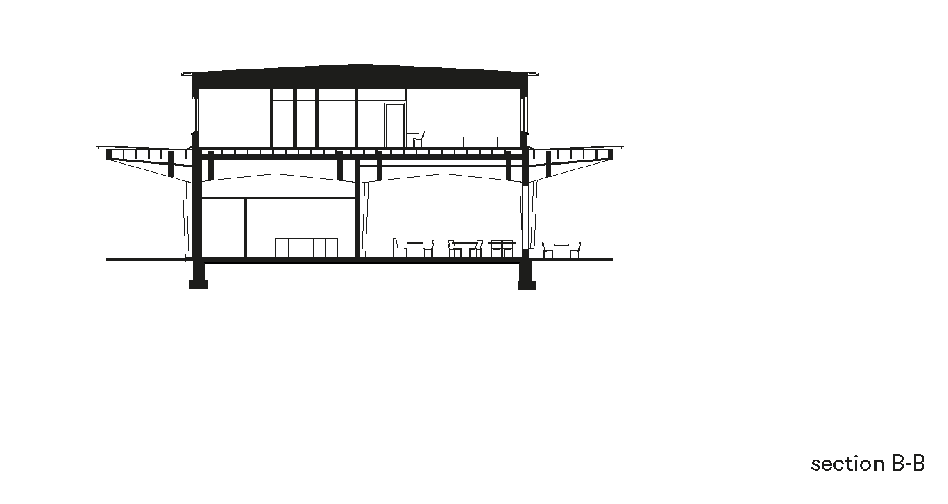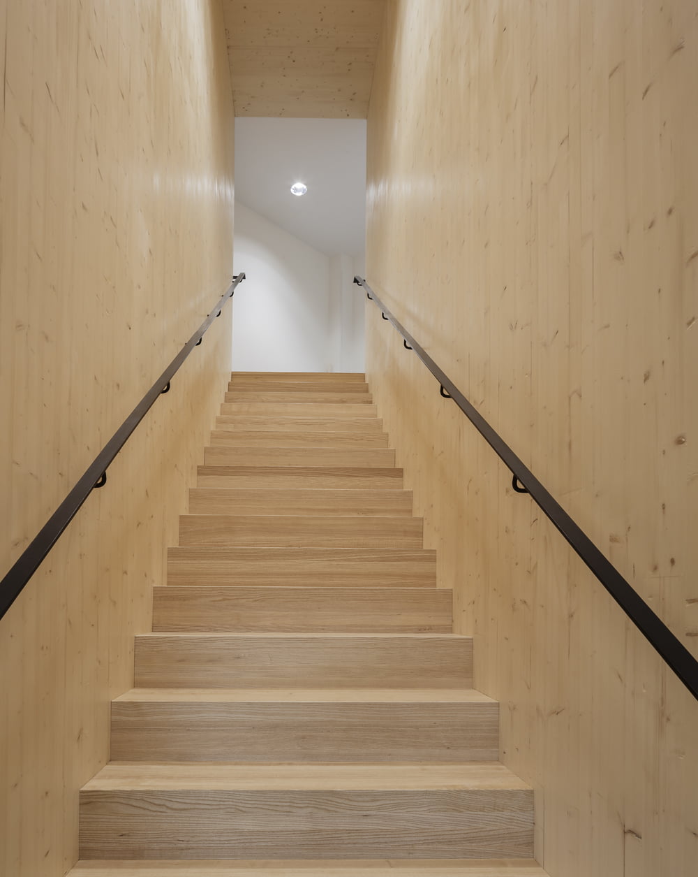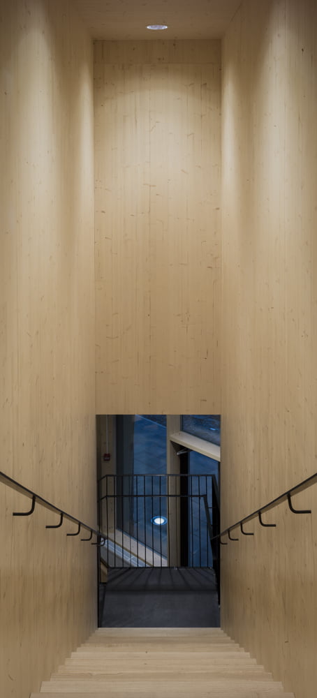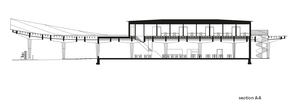 All supporting functions are placed in black boxes under and on top of the canopy so they seem to disappear against the dark backdrop of the forest. The columns are made of glued laminated timber sourced from local wood. CLT (cross laminated timber) walls in the interior enhance the natural atmosphere and bring a sense calm to the place, not typically found in a rest stop. On the second floor are 10 hotel rooms with views towards the lake and a sauna area to relax and recharge one’s batteries.