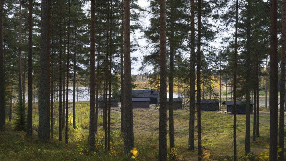 The architecture of the buildings on the campsite take their inspiration from the vernacular buildings that were already on there. The new buildings are stained black so as to blend into nature. This also helps the original buildings stand out.