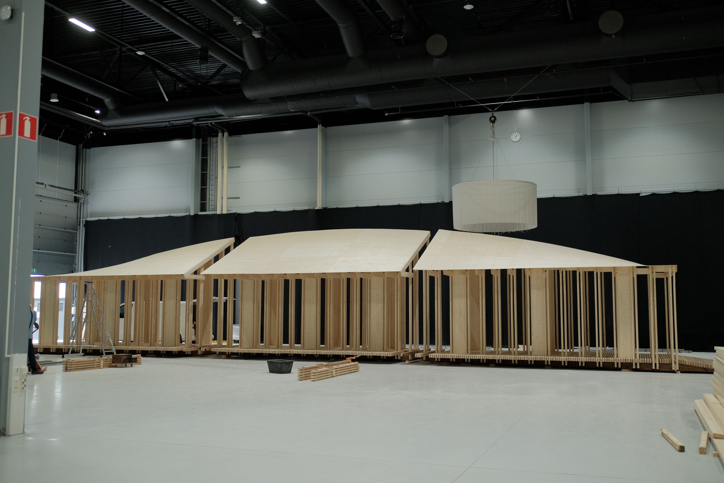 The challenging carpentry for the pavilion was handled by using three prefabricated modules, which were designed to meet the dimensions allowed in road transport. The pavilion has 23 different frame structures that create a curved interior and roof, and its 9 stiffening frames also form entrances that visually divide up the interior. The frame panels simultaneously serve as backgrounds for information boards and provide arc shaped lighting for the fixed seating. Impregnated wood was used where the pavilion comes into the contact with the ground as the more environmentally friendly vinegar-treated wood was not available in the required time frame. The pavilion’s wooden floor is made of larch installed on its side, and the wooden structures are made of spruce.