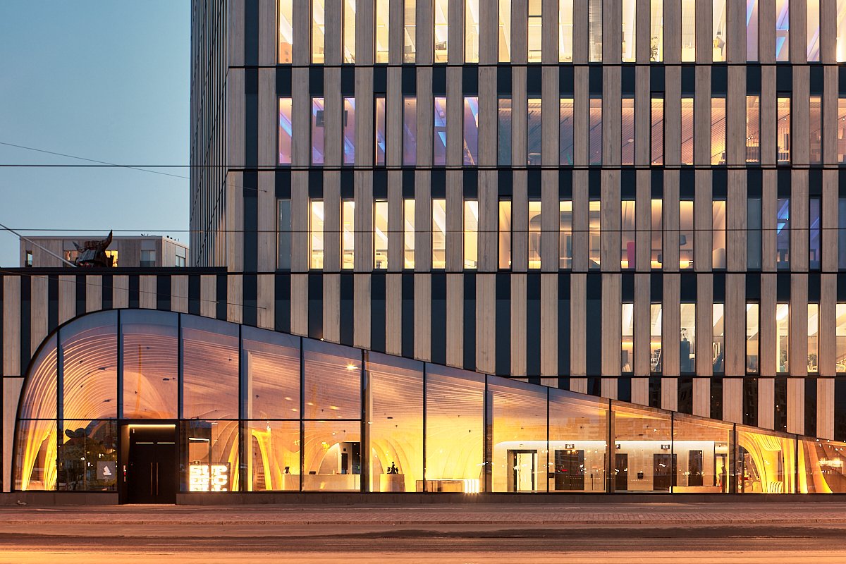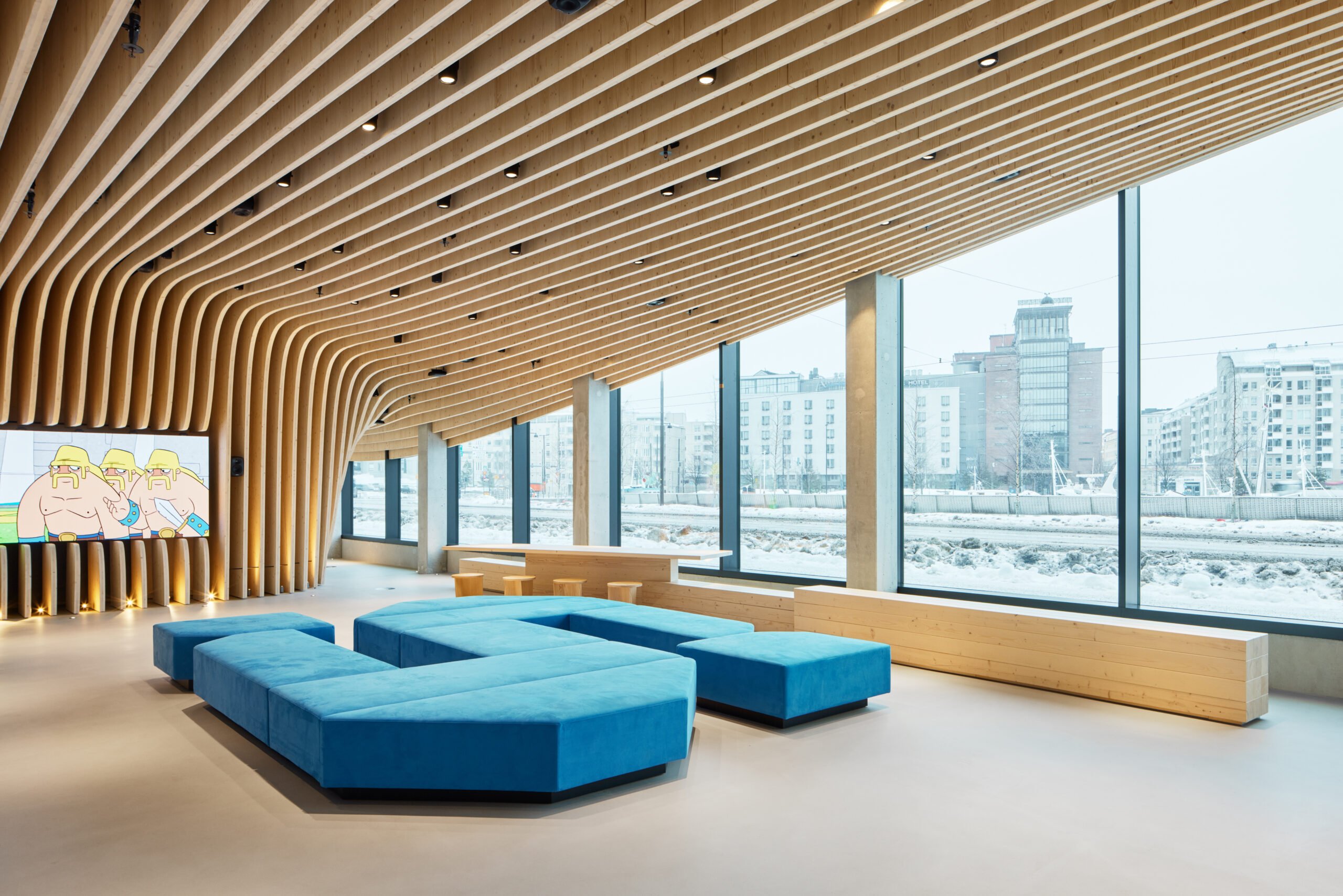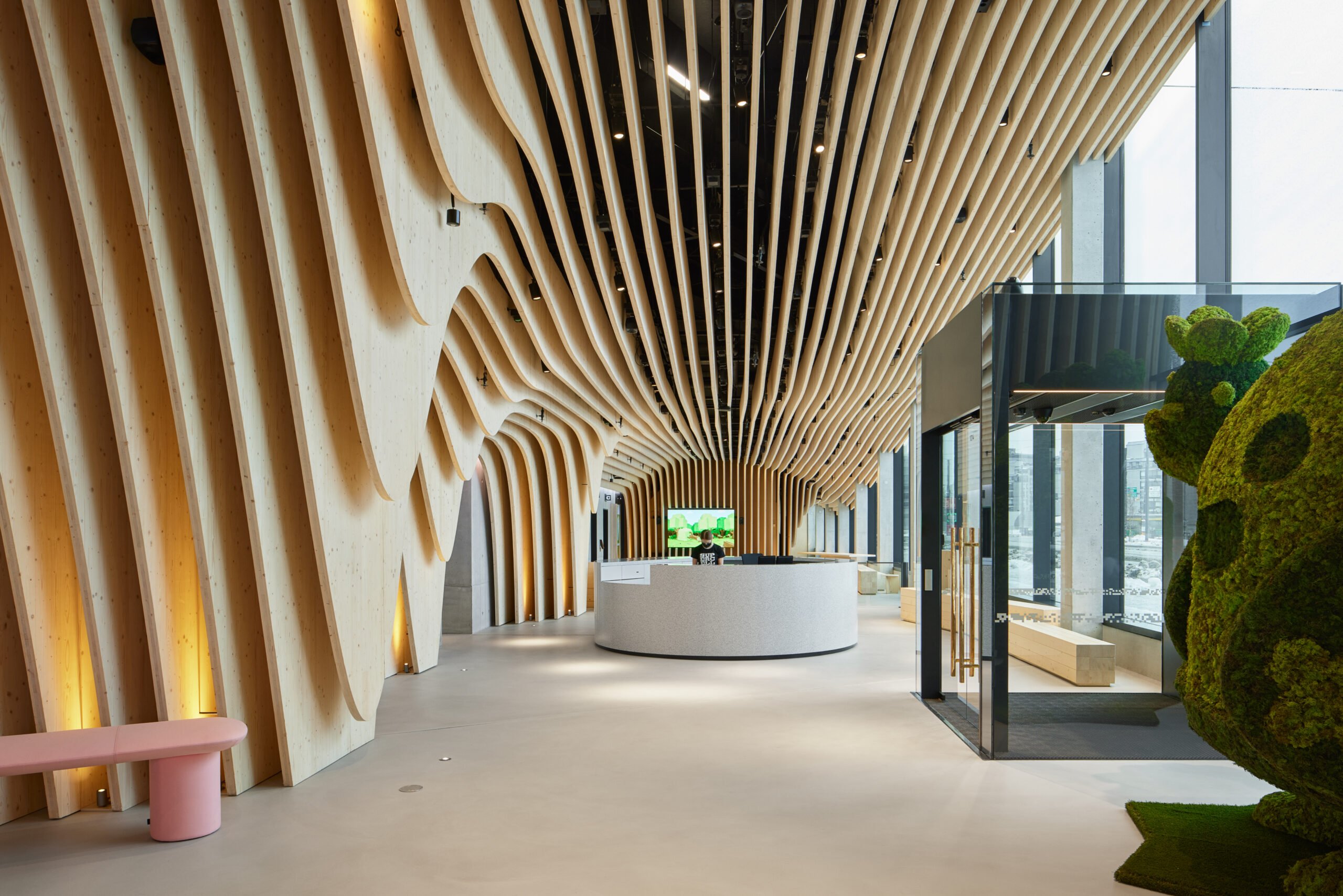 Veistoksellinen maantasokerros on verhoiltu kuusesta valmistetuilla CLT-lamellirakenteilla. Aulan puurakenteiden mitoitus perustuu palotekniseen mallinnukseen. Algoritmien avulla muotoiltu aaltoileva kokonaisuus sisältää yli 1700 neliömetriä CNC-työstettyjä yksilöllisiä lamelliaihioita. Puu on koettavissa kaikin aistein: se näkyy, tuoksuu ja tuntuu.