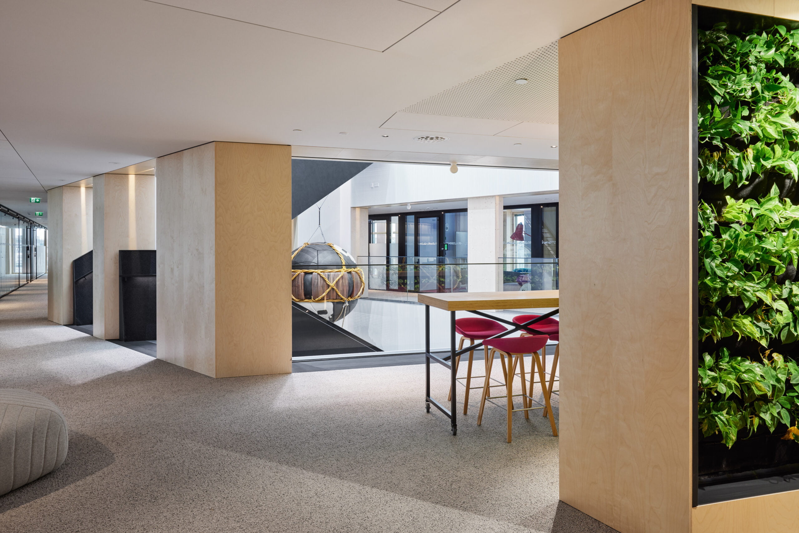 Sisätiloissa puu on materiaalina vahvasti läsnä. Kantavat pilarit ja palkit ovat puulevyin verhoiltuja LVL-rakenteita ilman paloteknistä suojaverhousta. Näkyvän rakenteellisen puun määrä noudattaa 20 %:n periaatetta. Puuta on käytetty tila- ja sisustuskonseptien pohjalta eri muodoissa seinien, kattojen ja lattioiden pintamateriaaleina sekä kiinto- ja irtokalusteissa.