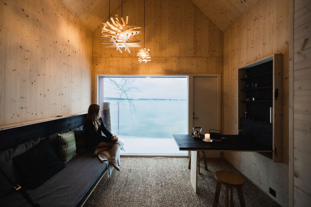 Puu vaimentaa ääniä ja luo sisätiloihin rauhallisen ja harmonisen tunnelman. Sisäpinnat on jätetty käsittelemättömiksi tai viimeistelty öljyvahalla, jotta puun luonnollinen ulkonäkö ja tekstuuri pääsevät esille. Puu patinoituu ajan myötä kauniisti, vahvistaen sen luonnetta ja yhteyttä ympäristöön. Rakennusten muotoilu on yksinkertaista ja korostaa puun roolia päämateriaalina. CLT ja Dold-massiivipuiset kolmikerroslevyt sisäpinnoilla ja kalusteissa mahdollistavat pelkistetyn listattoman yksiaineisen kokonaisuuden.