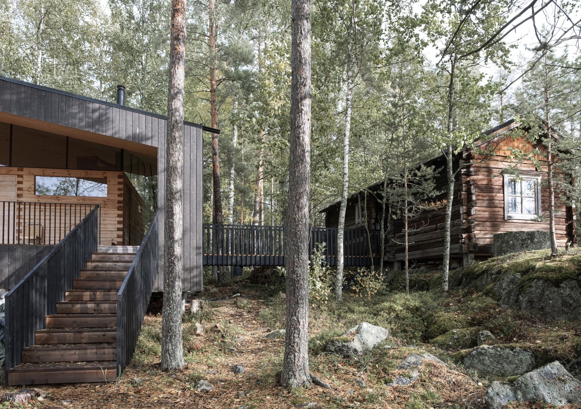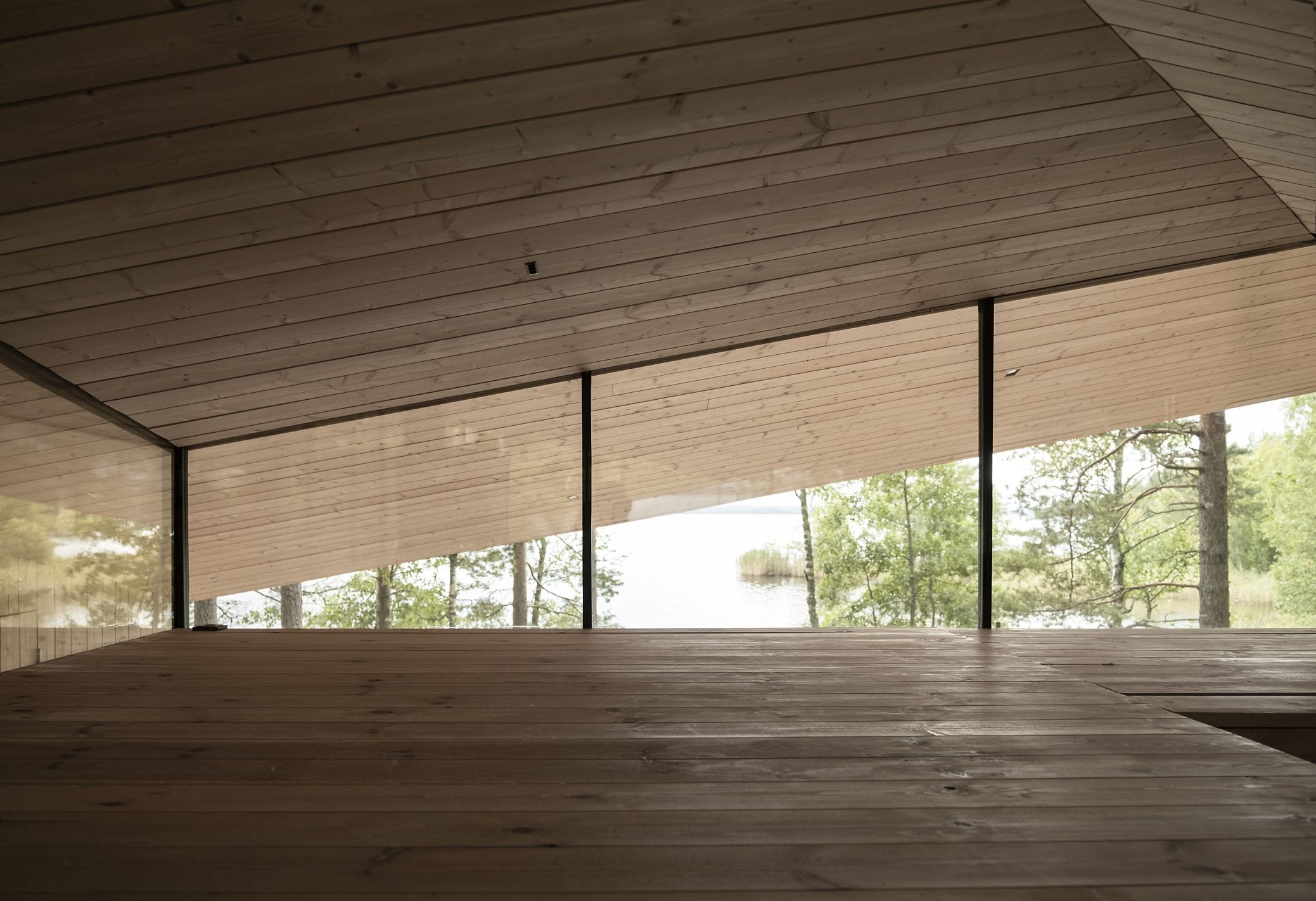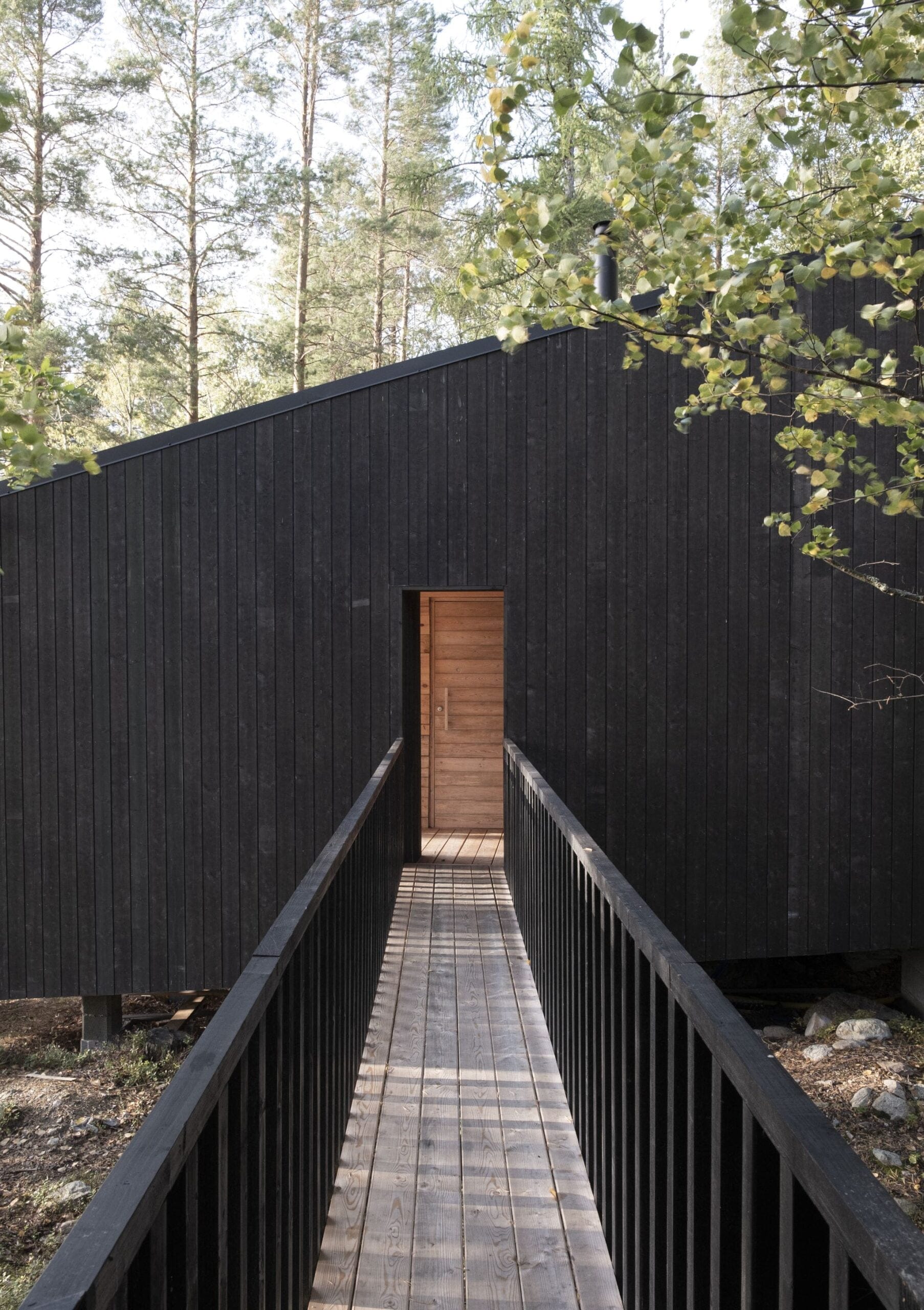 Mökin ja vanhan hirsiaitan välillä on rakennukset yhdistävä kävelysilta. Rakennuksen katon ja päätyjulkisivujen muodostama tumma kehärakenne ympäröi hirrestä rakennettua kuutiomaista saunaa, jonka päälle sijoittuu lasiseinäinen parvi. Vinottain nurkasta nurkkaan kulkeva harja muodostaa sisätilaan purjemaisen sisäkaton, jonka korkeus vaihtelee rakennuksen eri puolilla. Hirsikehikon ja päätyseinien väliin rajautuu kahteen suuntaan avautuva lasiseinäinen tupa ja toiselle puolelle kapea ulkotila saunomisen jälkeiseen vilvoitteluun.