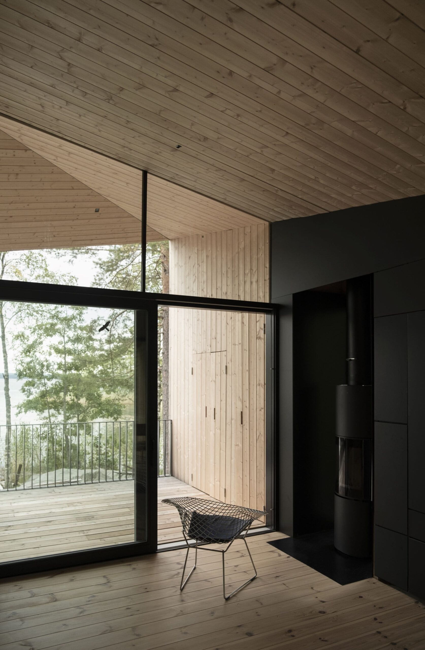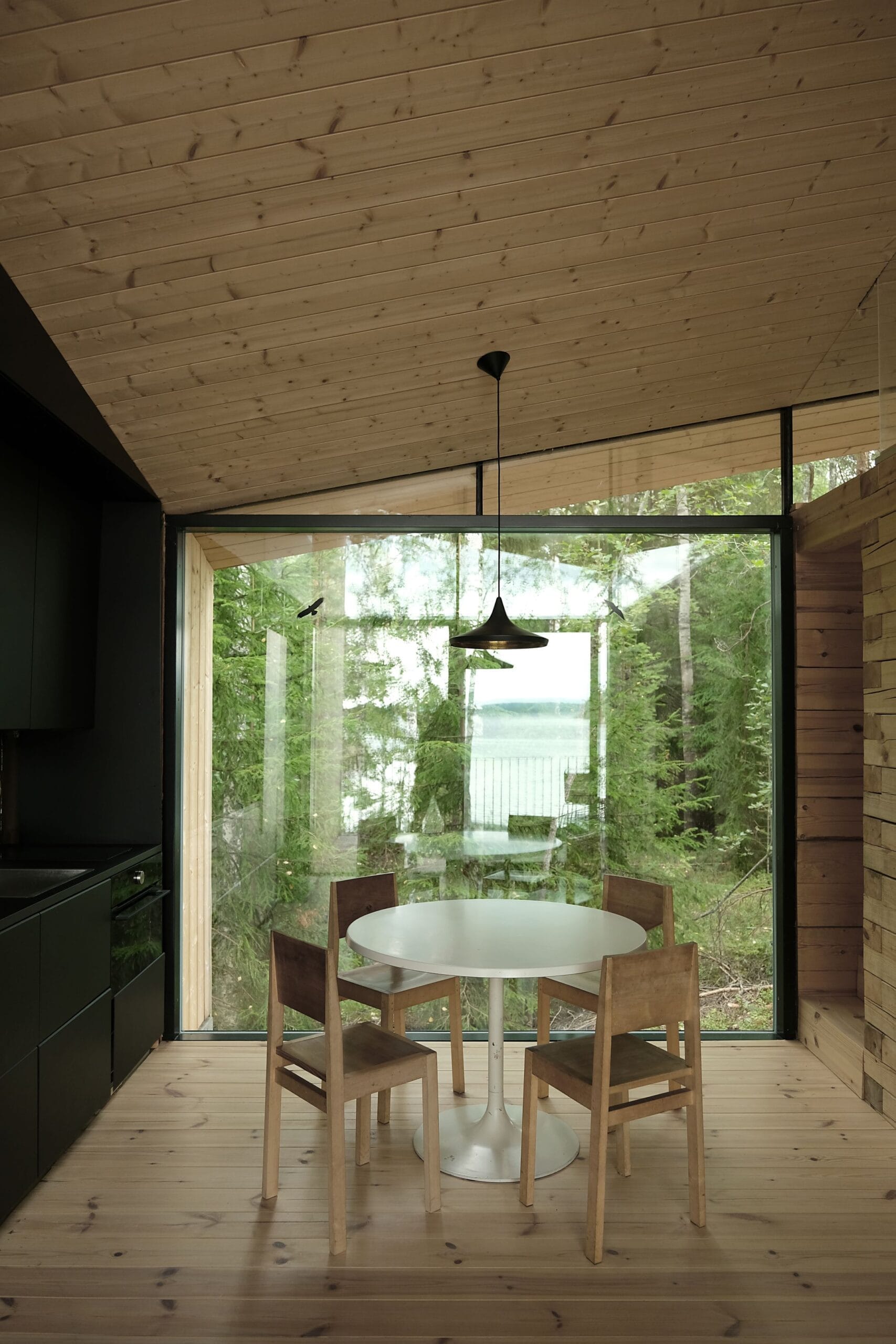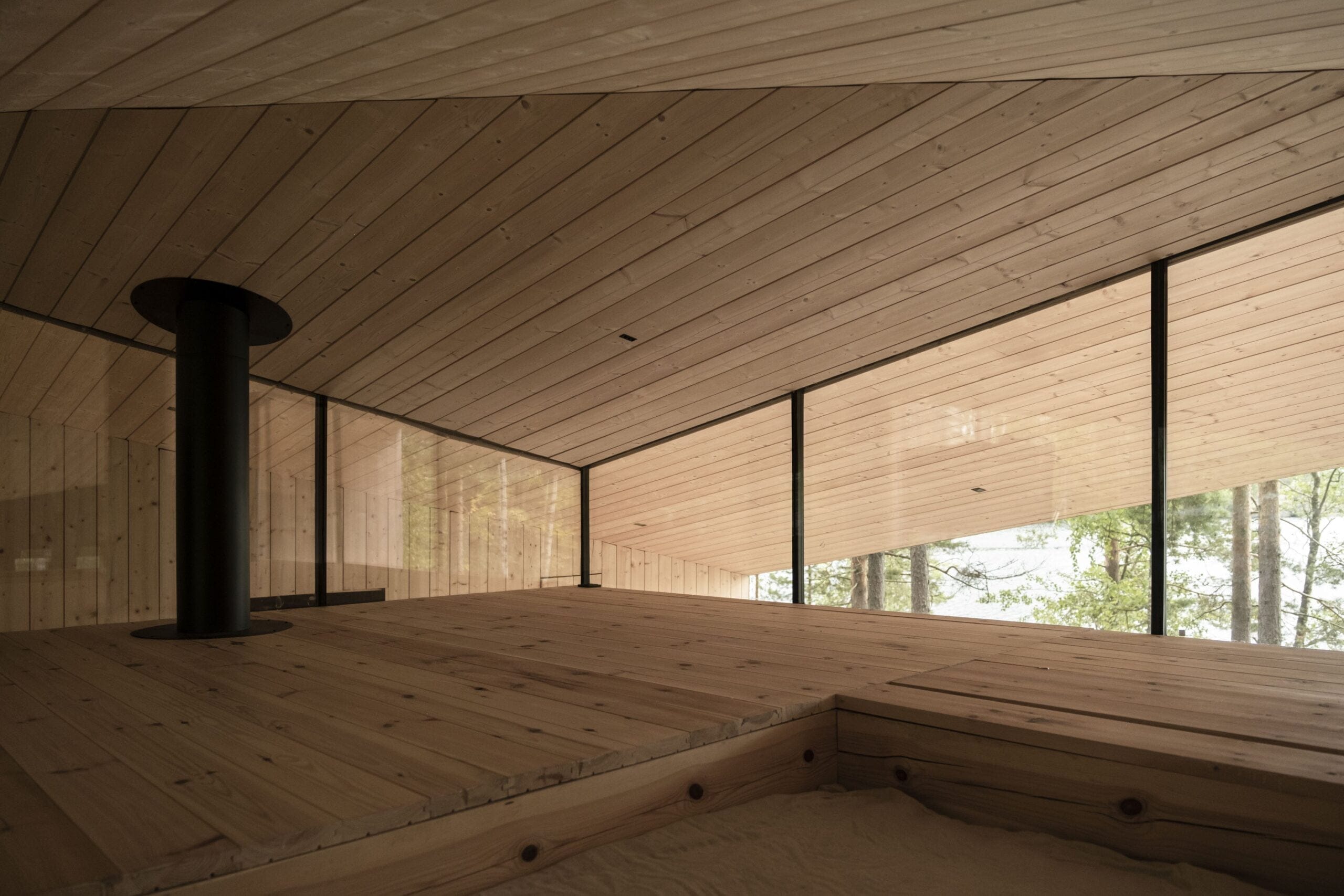 Keittiö, takka, ulkovarastot ja neljä metriä korkea tila ulkosuihkulle ovat integroitu osaksi tummaa kehärakennetta. Saunan lauteet on rakennettu latomalla hirsirakenteiden tapaan. Lauteisiin integroitu vesiallas toimii myös saunan valaisimena heijastaen valoa veden läpi saunan kattoon. Saunan karmittomasti hirsikehikkoon asennetusta ikkunasta avautuu pitkä panoraamanäkymä Päijänteen selälle.