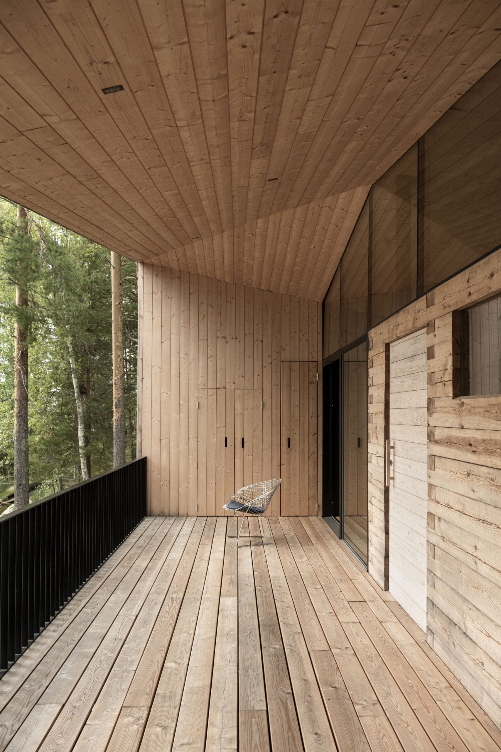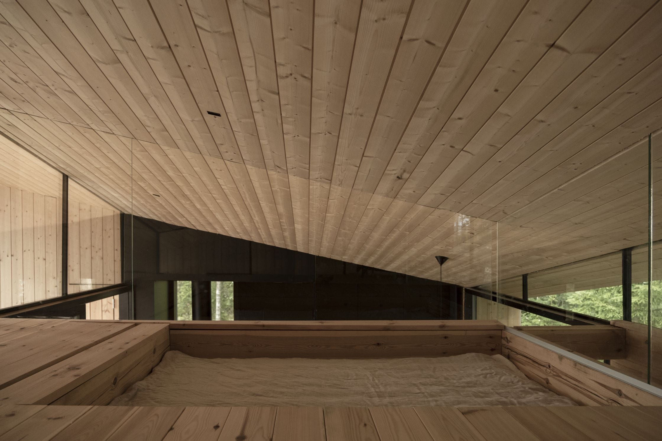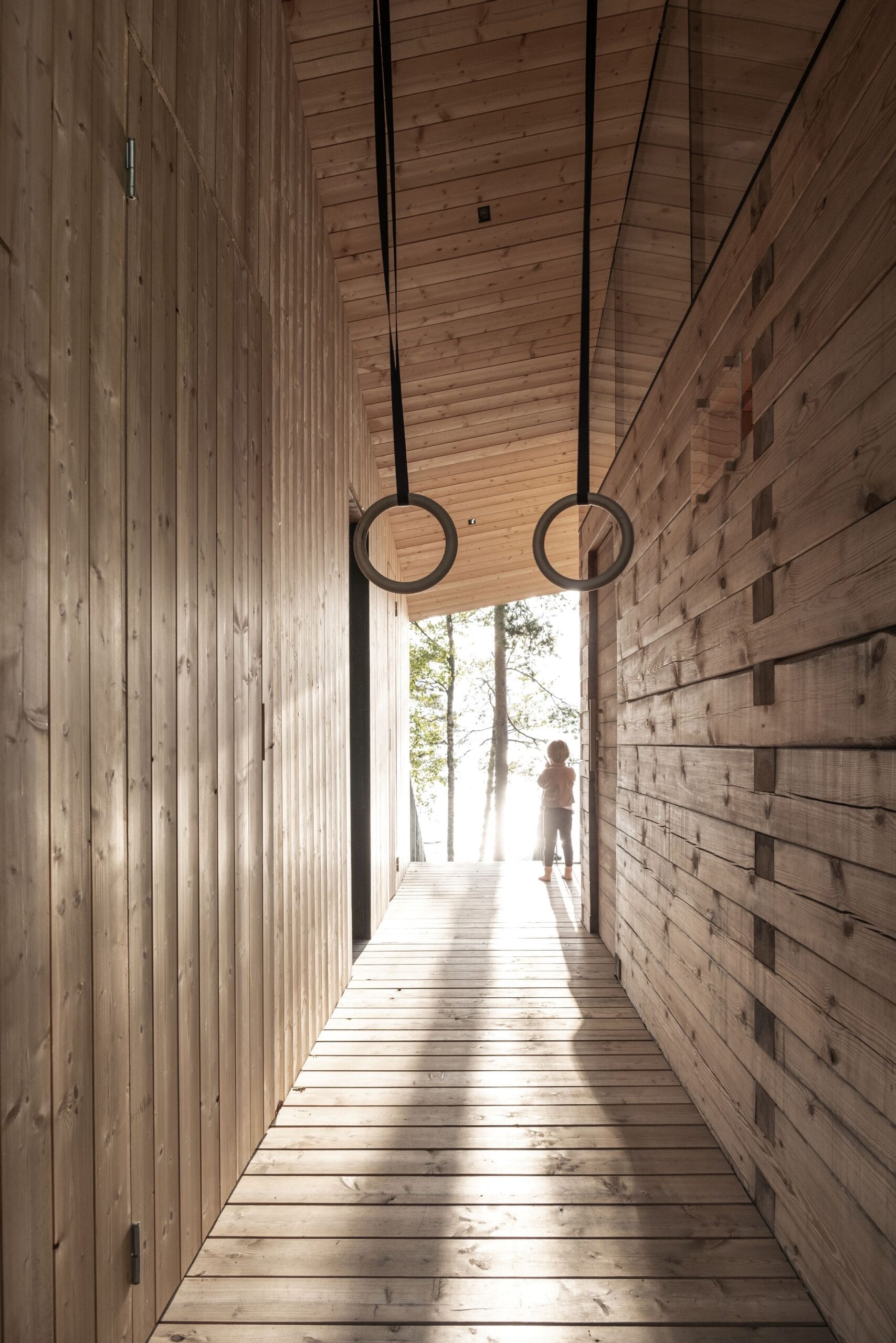 Keittiö, takka, ulkovarastot ja neljä metriä korkea tila ulkosuihkulle ovat integroitu osaksi tummaa kehärakennetta. Saunan lauteet on rakennettu latomalla hirsirakenteiden tapaan. Lauteisiin integroitu vesiallas toimii myös saunan valaisimena heijastaen valoa veden läpi saunan kattoon. Saunan karmittomasti hirsikehikkoon asennetusta ikkunasta avautuu pitkä panoraamanäkymä Päijänteen selälle.