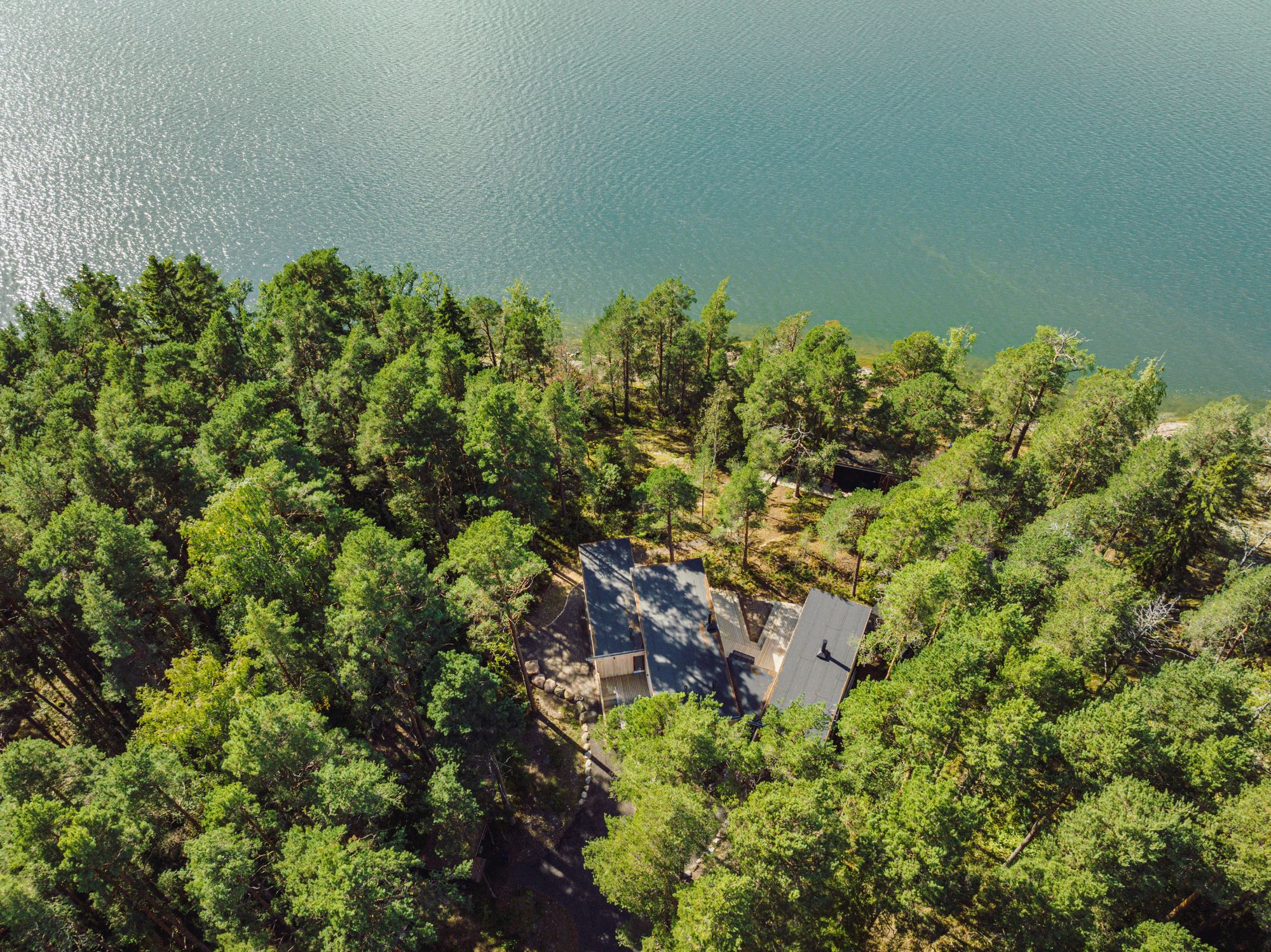 Rakennus on harkitusti sijoitettu paikalleen pienten avokallioiden taakse ja mäntyjä väistäen. Huvilan viuhkamaisen muodon avulla aitta on otettu osaksi kokonaisuutta, samalla kuin muoto huomioi hankkeen teeman, näköalat ja kiinteistön rajat. Huvila jakautuu toiminnallisesti kahteen yksikköön, toinen n. 75m2, toinen n. 34m2 jotka jakavat sisäänkäynnin, wc-tilan, tekniikan ja terassit.