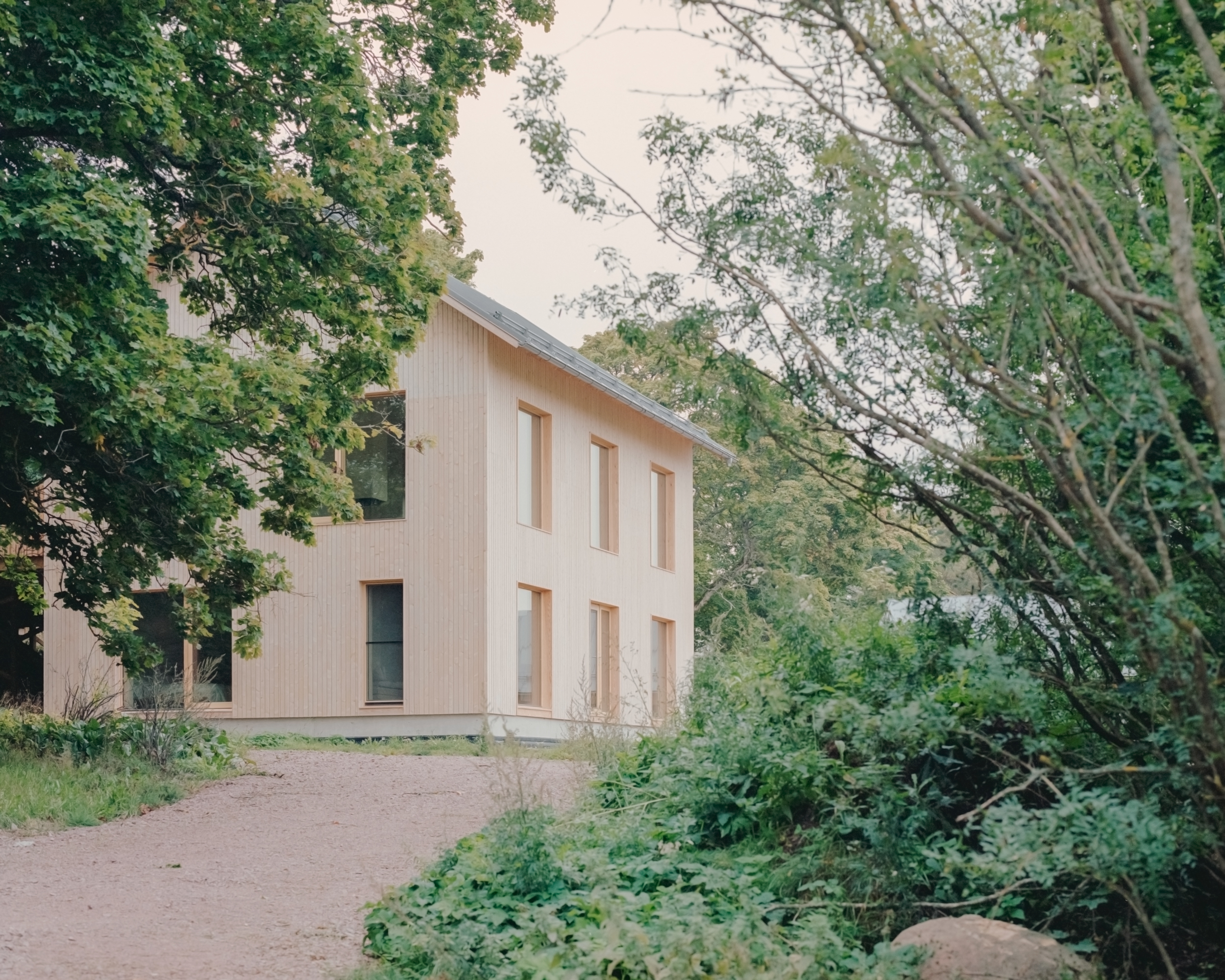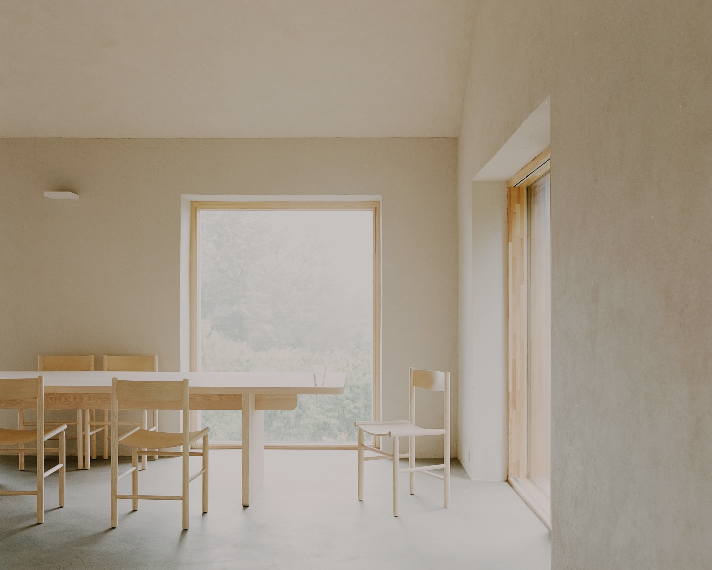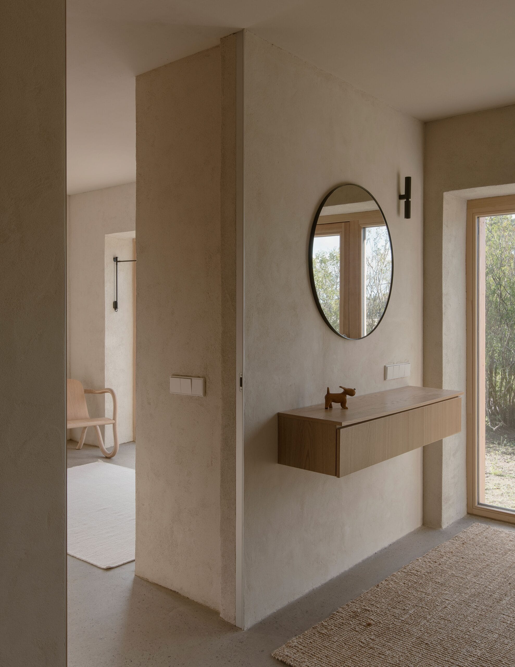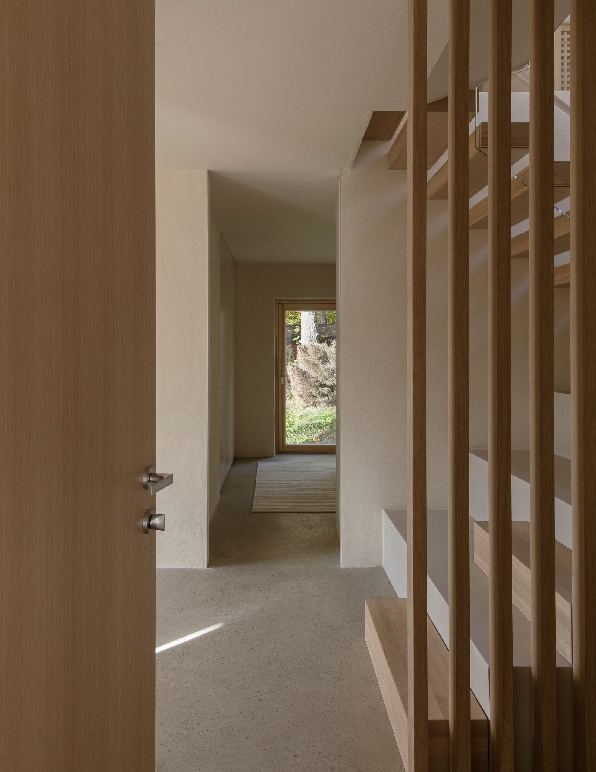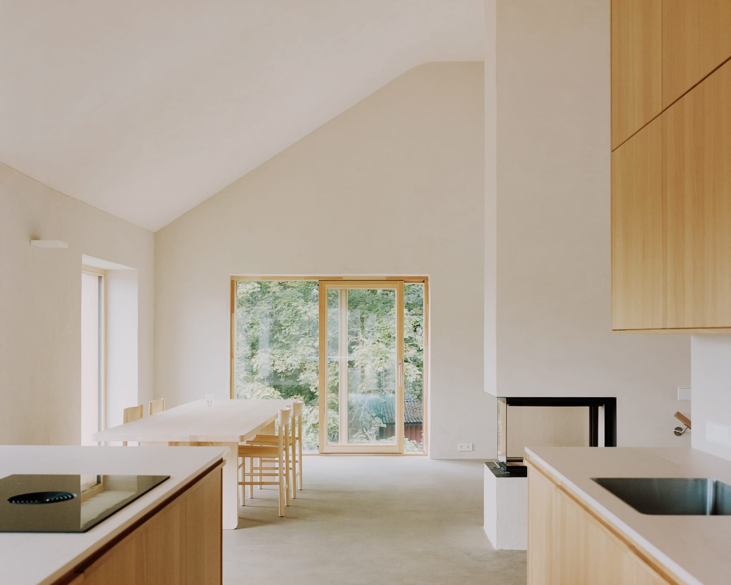 Talousrakennuksessa sijaitsevat työhuone, pieni kuntoiluhuone ja autokatos. Päärakennuksen asuintilat on sijoitettu siten, että olohuone, ruokailutila, keittiö ja saunatilat sijaitsevat yläkerrassa, mikä maksimoi näkymät ympäröivään maaseutuun ja kallioisiin maisemiin. Keskeisenä elementtinä on kolmeen suuntaan avautuva tulisija, joka mahdollistaa tulen loimusta nauttimisen kaikista keskeisistä tiloista. Makuuhuoneet on sijoitettu alakertaan, vanhan suojaisan puutarhan äärelle.