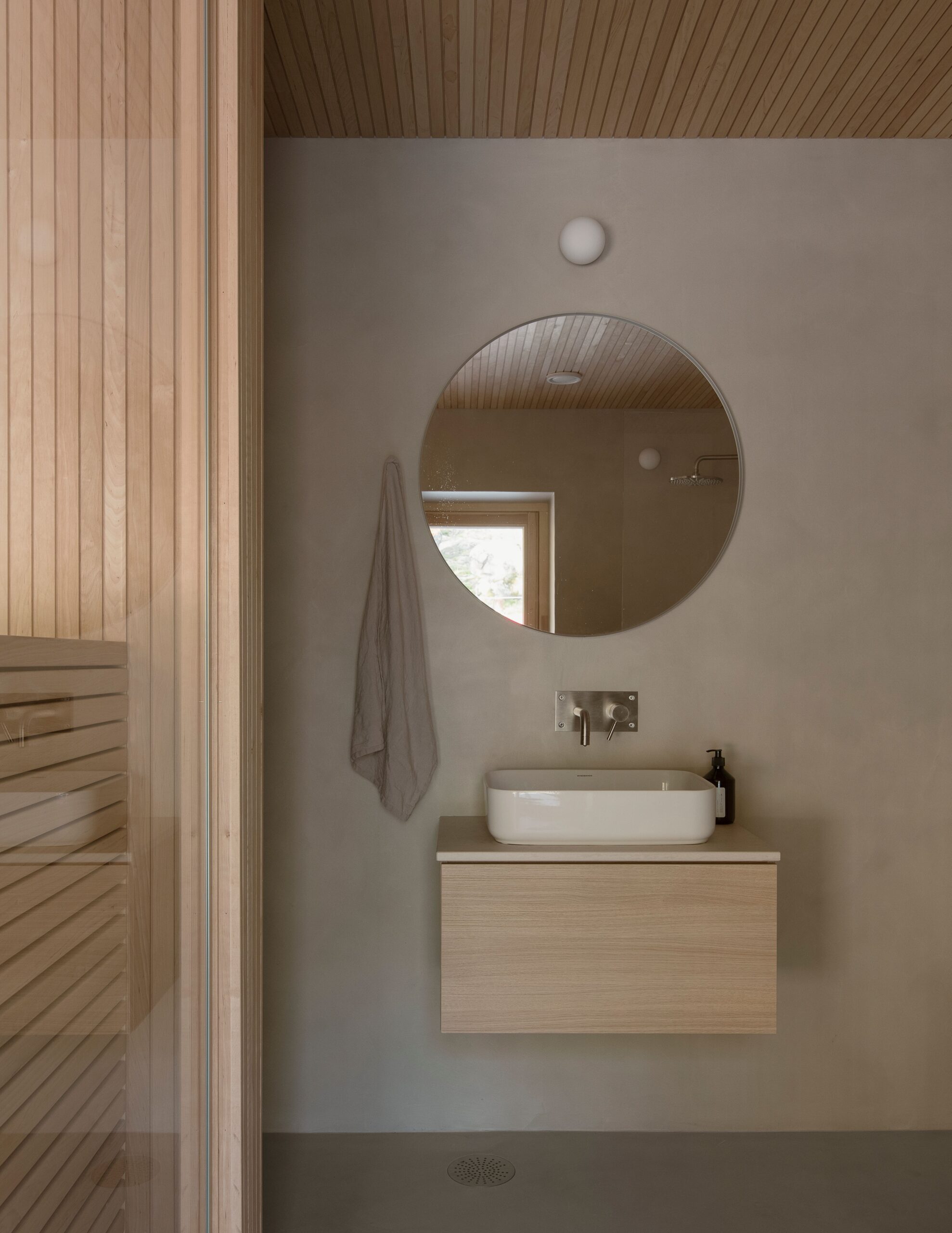 Sisäpinnoiltaan olkielementit on rapattu paksulla savirappauksella (2-kerrosrappaus), joka tasaa tehokkaasti ilman kosteutta ja lämpötilaa, luoden miellyttävän ja tasaisen sisäilmaston. Savirappaus jatkuu yhtenäisesti myös kattopintoihin, korostaen tilan harmonisuutta. Kuivan tilan lattiana molemmissa kerroksissa on Luonnonbetonin massiivisavilattia, johon on integroitu vesikiertoinen, maalämmöllä lämpiävä lattialämmitysputkisto. Rakennusten julkisivut on verhoiltu kuusilaudalla, joka on puunsuojakäsitelty piihin perustuvalla Organowood-pintakäsittelyä, mikä mahdollistaa julkisivujen luonnollisen harmaantumisen ja sulautumisen ympäröivään kallio- ja metsämaisemaan. Kattomateriaalina on käytetty Ruukin konesaumattua peltiä, joka on päällystetty biopohjaisella GreenCoat-pinnoitteella, mikä lisää katon kestävyyttä ja ympäristöystävällisyyttä.