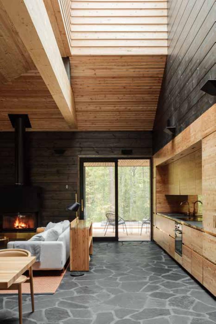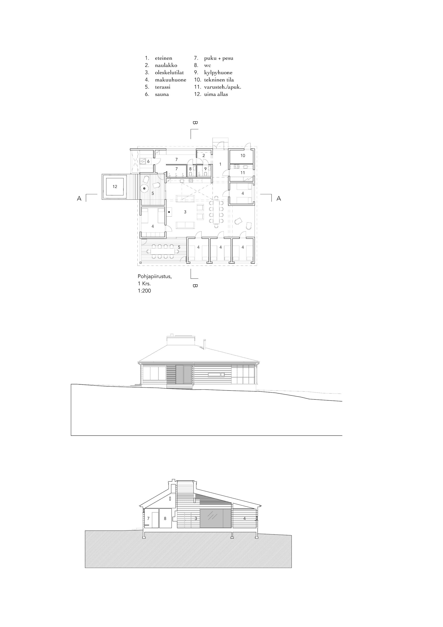 ”Nuotiopaikka” toimii tapahtumien keskipisteenä aamupalasta illalliseen. Katon suuri lasiaukko tuo tilaan pehmeää epäsuoraa valoa ja luo rauhallisen kotamaisen tunnelman. Oleskelutilaa ympäröiviin ”aittoihin”/makuuhuoneisiin voi vetäytyä lepäämään reippaan ulkoilun jälkeen, kukin omaan tahtiin. Yksi ”aitoista” on varattu huoltotiloille ja catering-palveluille ja yksi pesu- ja saunatiloille.