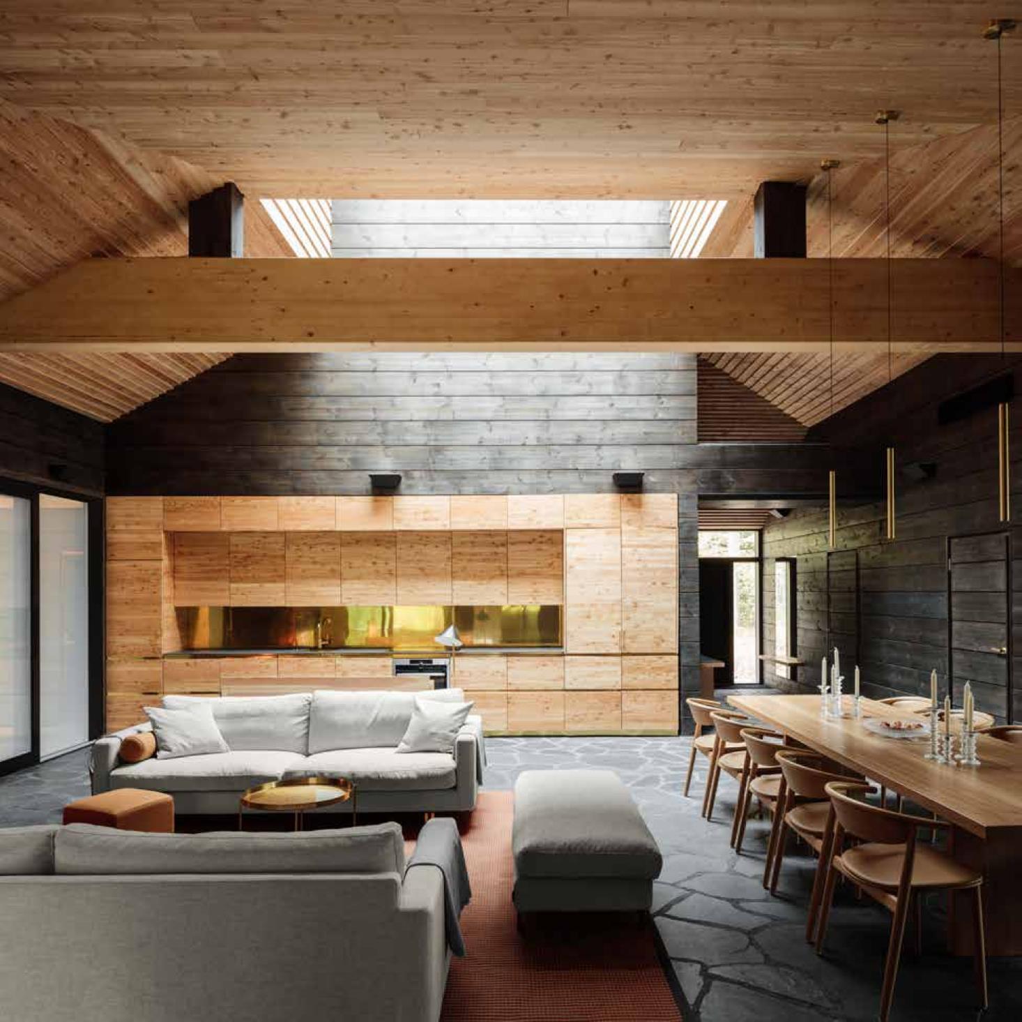 Rakennuksen runko on mäntyä ja toteutettu painumattomasta ristiin liimatusta hirrestä (CLT-hirsi). Lähes kaikki muut pinnat on toteutettu tilaajan suvun kasvattamista lehtikuusista.