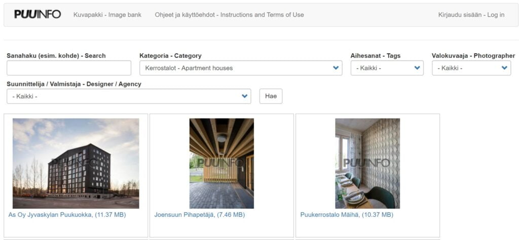 Puuinfon kuvapakki sisältää korkeatasoisia, painokelpoisia valokuvia suomalaisesta puurakentamisesta ja puutuotteista sekä niiden käytöstä rakentamisessa. Kuvat ovat jpg-tiedostomuodossa.
