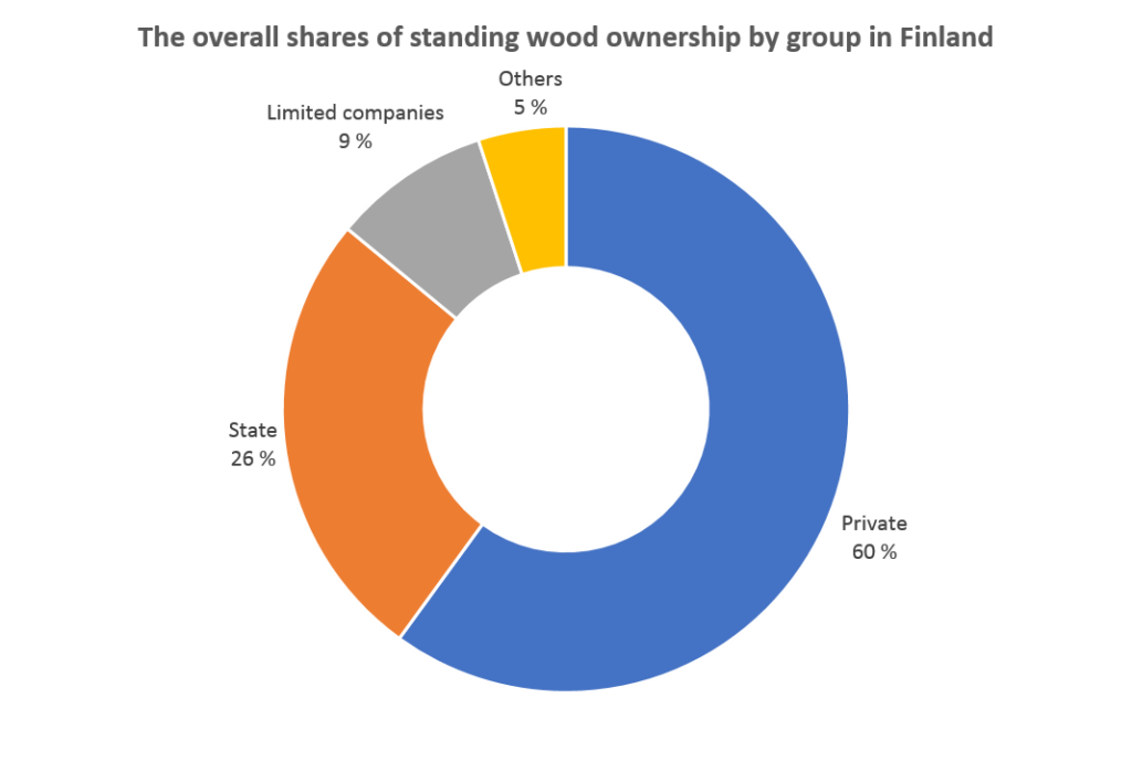 The private sector owns 60% of the area of forests, the state 26% and the forest industry 9%. The remaining 5% is split between municipalities, parishes, forest collectives and other organisations.