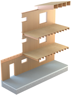 Das in Holzhäusern hauptsächlich verwendete Rahmensystem ist der auf Tragenden Wänden beruhende Holztafelbau. Die tragenden Wände können entweder aus einer Rippenstruktur bestehen oder mit Großelementen aus Massivholz ausgeführt werden. Durch Zwischenbodenkonstruktionen aus Holz kann eine Spannlänge von etwa 7 Metern erreicht werden. Die Außenwände des Gebäudes und ein Teil der Zwischenwände, normalerweise Wände zwischen Wohnungen, sind normalerweise tragend. Die Böden und ein Teil der Wände dienen als versteifende Teile des Gebäudes.