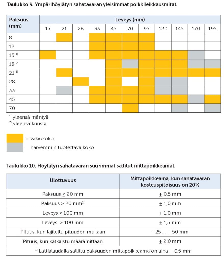 Tavallisesti sahatavaran kaikilta sivuilta höylätään vähintään 2 mm. Näin ollen pinnasta tulee sileä eikä siinä näy sahausepätasaisuuksia eikä höyläyksestä johtuvia harjanteita. Höylätyn sahatavaran yleisimmät poikkileikkausmitat on esitetty taulukossa 9. Mitat tarkoittavat nimellismittoja sahatavaran kosteuspi-toisuuden ollessa 20 % ja niissä sallitaan taulukossa 10 esitetyt mittapoikkeamat. Höylätyn sahatavaran yleisimmät pituudet vaihtelevat 300 mm:n välein välillä 2,7…5,4 m.