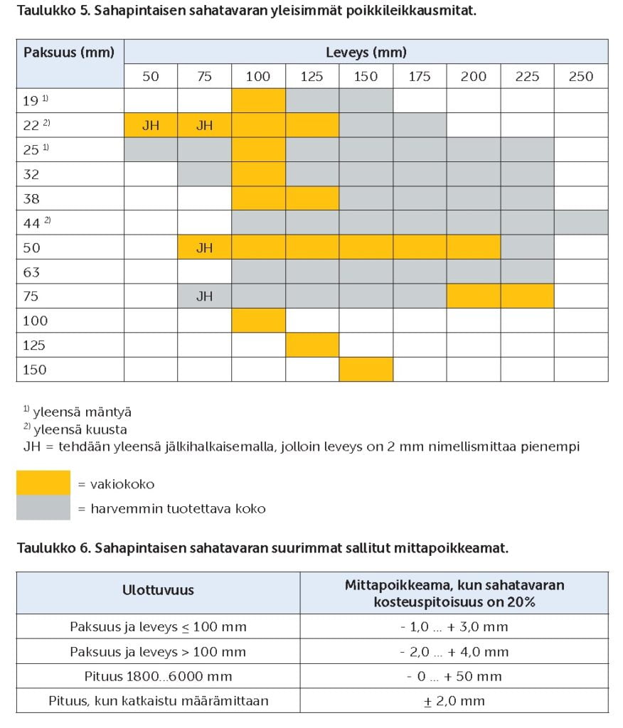 Sahapintaisen sahatavaran yleisimmät poikkileikkausmitat on esitetty alla olevassa taulukossa 5. Mitat tarkoittavat nimellismittoja sahatavaran kosteuspitoi-suuden ollessa 20 % ja niissä sallitaan taulukossa 6 esitetyt mittapoikkeamat. Sahapintaisen sahatavaran yleisimmät pituudet vaihtelevat 300 mm:n välein välillä 2,7…6,0 m.