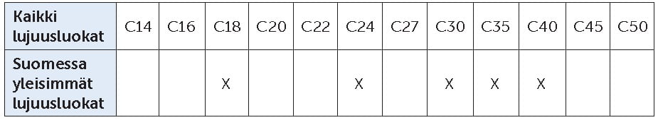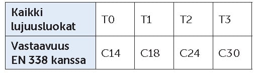 Standardin EN 338 mukaan havupuusahatavara lujuuslajitel-laan taulukon mukaisiin lujuusluokkiin. Lujuusluokat C14…C30 voidaan lajitella joko visuaalisesti tai koneellisesti ja lujuusluokat C35…C50 vain koneellisesti.