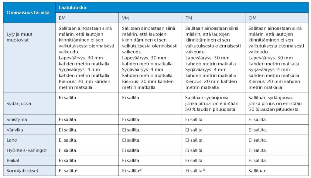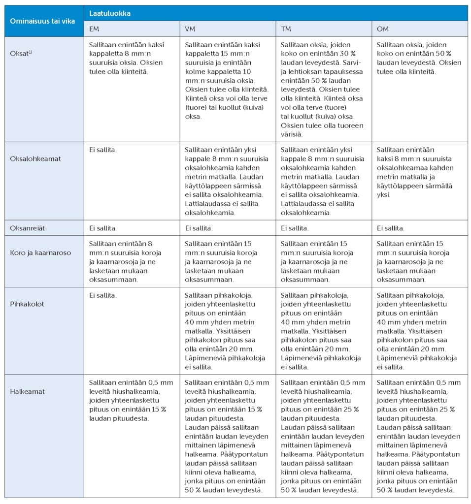 Sisäverhous- ja lattialautojen laatuluokitusta ei tehdä sahatavaran laatuluokituksen mukaan, vaan laatuluokituksessa noudatetaan alla olevia taulukoita.