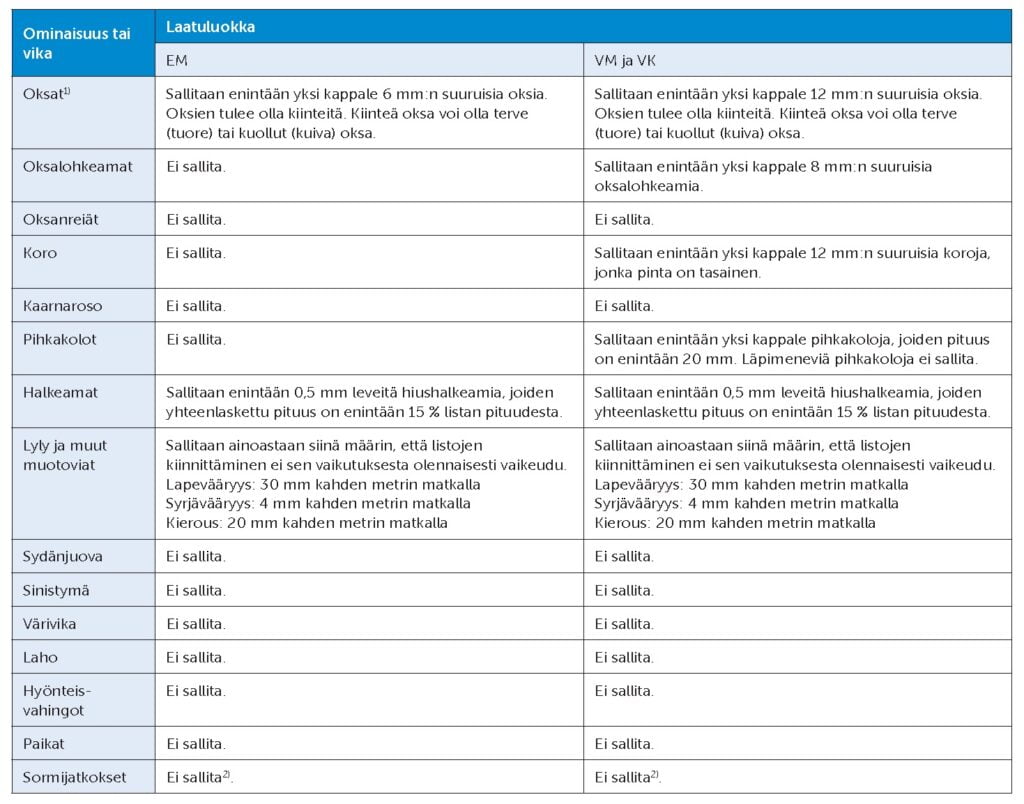Listojen laatuluokitusta ei tehdä sahatavaran laatuluokituksen mukaan, vaan laatuluokituksessa noudatetaan viereisen sivun tau­lukkoa. Taulukko osoittaa ominaisuuksien ja vikojen sallitun mää­rän listan huonoimmalla 1 m:n pituisella osalla.