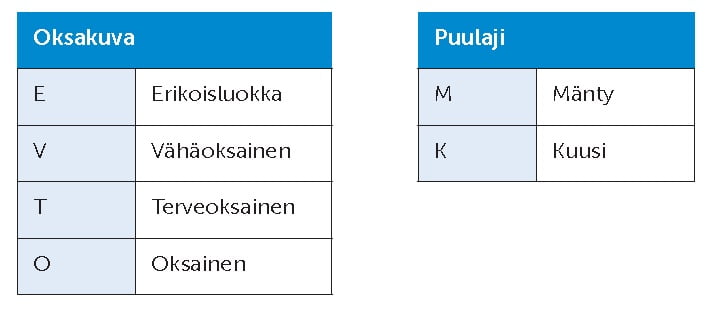 Käytännössä eri laatuyhdistelmiä on männyllä neljä ja kuusella kolme. Suluissa kunkin laatuyhdistelmän likimääräinen tuotannos­ta lankeava osuus.