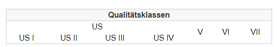 Die Hauptklassen sind US, V, VI und VII. A ist die höchste Qualitätsklasse und zu ihr gehört das Holz, das nach der Produktion die Klassifizierung US I – US IV bekommt. Die Klassen V und VI werden nicht in unterklassen eingeteilt. VII ist die unterste Qualitätsklasse und ihre Untergrenze ist nur wörtlich definiert, ohne genaue Tabellenwerte. In der Klasse VII werden alle Eigenschaften des Holzes ohne Einschränkungen zugelassen. Schnittholzprodukte müssen jedoch formstabil sein, und die Klinge muss jede Seite berührt haben.