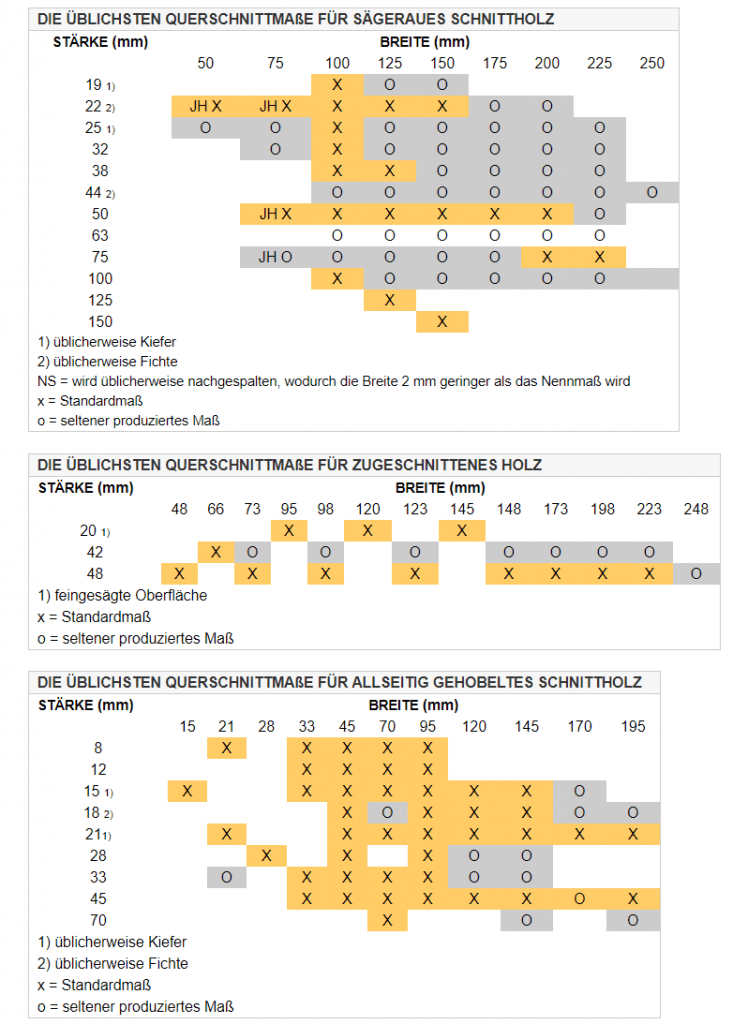 Die Standardmaße für Sägeraues Schnittholz, Zugeschnittenes Holz und gehobeltes Schnittholz sind in den folgenden Tabellen angegeben: