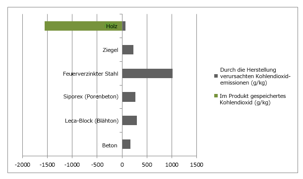 Die Kohlendioxidemission, die bei der Herstellung von Holzprodukten entsteht ist verhältnismäßig gering. Die Menge des im Holz gespeicherten Kohlendioxids ist um ein Vielfaches größer als die Emissionen. Wenn Holzprodukte nach der Verwendung energetisch wiederverwertet werden, verursachen sie allenfalls so viele Kohlendioxidemissionen wie im Holz während des Wachstums gespeichert worden ist.