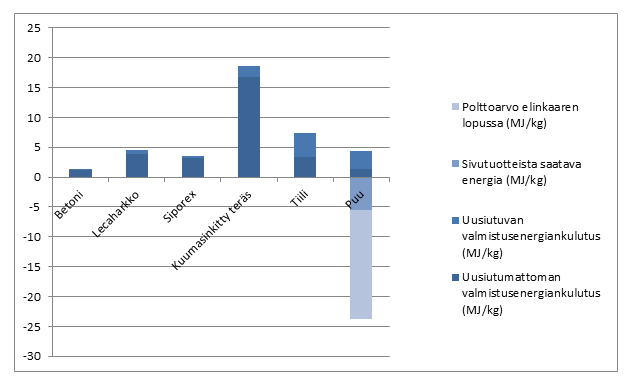 Eri rakennusmateriaalien valmistuksen aiheuttama energiakulutus. Taulukossa on eroteltu uusiutuvista ja uusiutumattomista energialähteistä tuotettu energia (Lähde: Rakennustiedon RT -ympäristöselosteet).