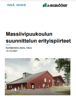 Massiivipuukoulun suunnittelun erityispiirteet -raportissa (A-Insinöörit 2021) tarkastellaan massiivipuurakennusta erityisesti seuraavilta osa-alueilta: kosteudenhallinta, paloturvallisuus, tiiveys ja sisäilmakysymykset. Jokaisen osa-alueen osalta selvennetään massiivipuurakentamiselle ominaisia piirteitä, poikkeavuuksia, määräyksiä ja lainsäädäntöä.