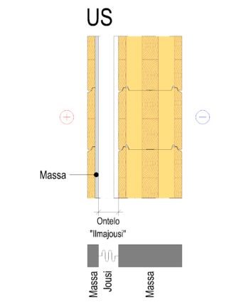Huoneistojen välisessä seinässä (HVS) levymäiset massat muodostetaan toisistaan erillään olevilla rungoilla. Hirsiseinässä rungot muodostuvat hirsiseinästä ja sen vieressä olevasta rankaseinästä. Runkopuoliskojen mekaaninen kytkentä heikentää seinän ääneneristävyyttä radikaalisti. Levymäisten massojen väliin jää ilmatila (”ilmajousi”). Mitä paksumpi ilmatila (ontelo) on sitä parempi on seinän ääneneristävyys. Täyttämällä seinän ontelo pehmeällä vaimennusmateriaalilla (tavallisesti villa), voidaan seinän ääneneristävyyttä parantaa 5…15 dB. Seinän onteloon ei tule asentaa yhtenäistä levytystä, koska levytys katkaisee ”ilmajousen” kahteen osaan. Tämä heikentää seinän ääneneristävyyttä matalilla äänentaajuuksilla.