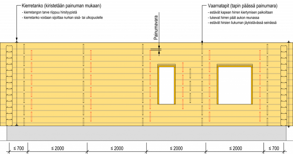Aukkojen pielet jäykistetään pieliin upotetuilla karapuilla, jotka mahdollistavat seinärakenteen painumisen. Aukon yläreunaan suositellaan vaakalankkua, joka kiinnitetään ristiruuveilla karapuihin. Karapuut ja vaakalankku muodostavat painumattoman kehikon johon ikkunan tai oven karmi kiinnitetään ja tiivistetään normaaliin tapaan. Painumavara jätetään vaakalankun yläpuolelle ja täytetään kokoon painuvalla eristeellä. Karapuun ja hirren välin asennetaan tiiviste. Samojen tiiviys valmistetaan sisäpuolisella teippauksella.