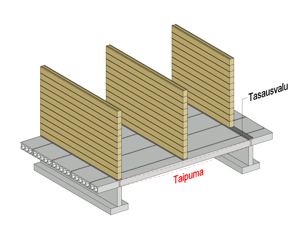 Kaikki kantavat pystyrakenteet tulisi perustaa painumattomille tuille. Kantavia seiniä ei suositella asemoitavaksi esimerkiksi ontelolaataston jänteelle, koska laataston taipuma saattaa aiheuttaa puurunkoon haitallisia pystysuuntaisia muodonmuutoksia. Kyseinen asia tulee tutkia tapauskohtaisesti, koska se on riippuvainen laataston jännevälistä ja seinän kuormituksen suuruudesta.