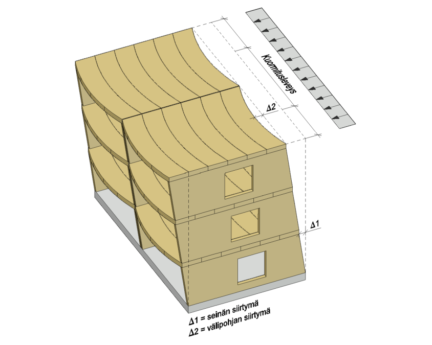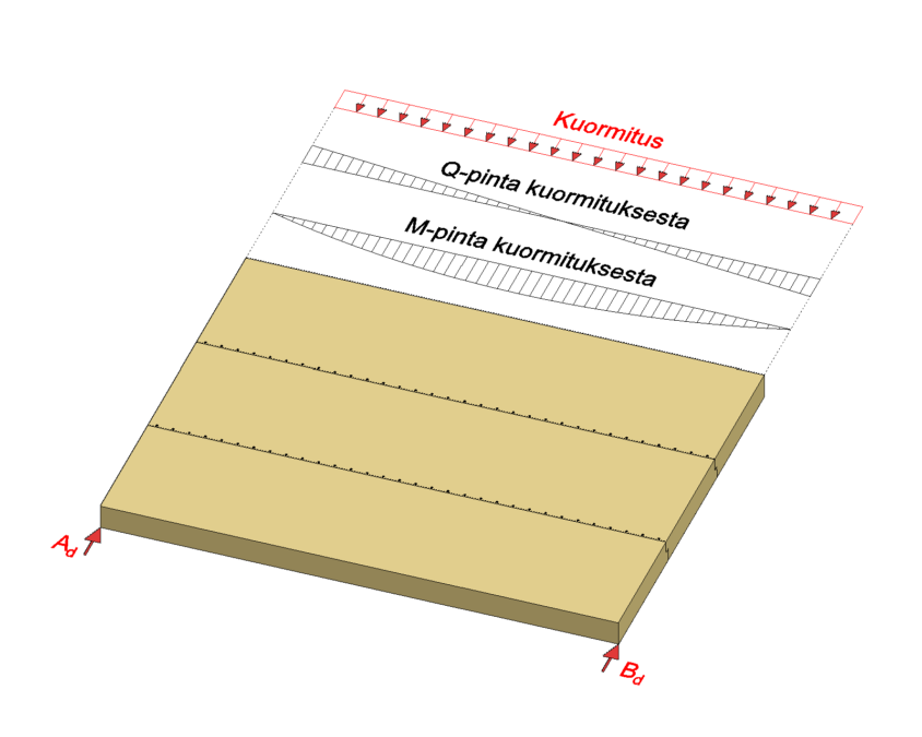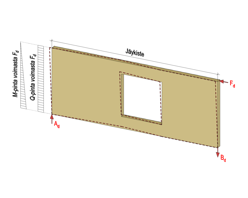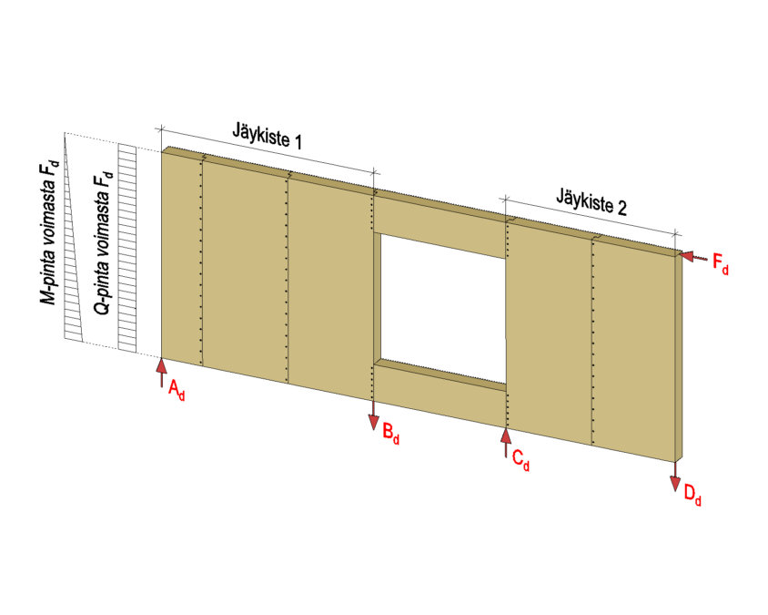 Massiivipuulevyseinä vastaanottaa leikkausvoiman (Q), joka levylle aiheutuu seinän yläpinnassa vaikuttavasta vaakavoimasta Fd. Vaakavoiman aiheuttama momentti (M) vastaanotetaan jäykis teen päissä olevalla tukipinnalla.