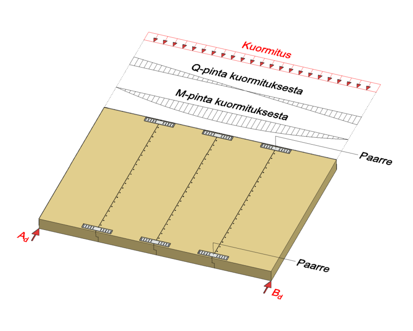 Tapauksessa, jossa vaakakuormitus kohdistuu rinnakkaisten massiivipuulevyjen pitkälle sivulle, voidaan massiivipuulevyt suunnitella toimimaan rinnaikkaisina palkkeina, joille kuormitus jakautuu levyjen jäykkyyksien suhteessa.