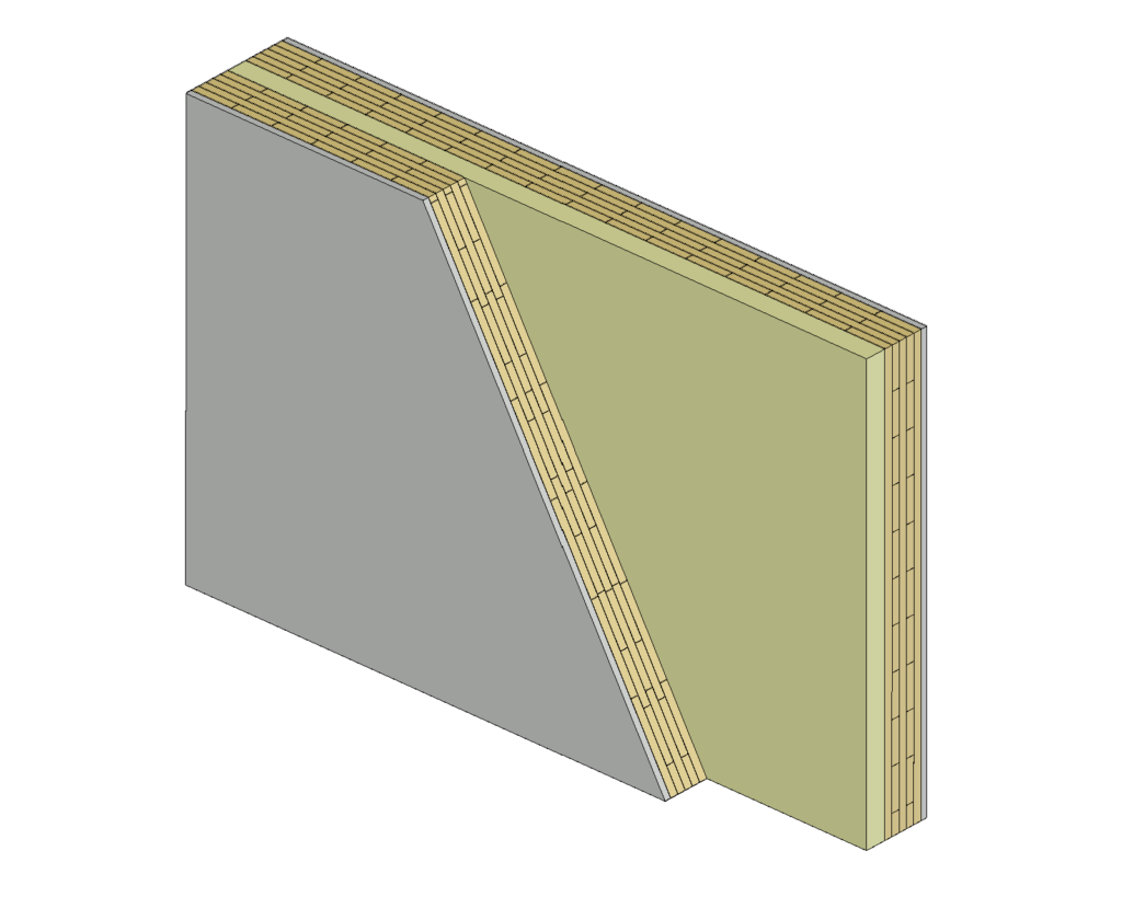Massiivipuulevyrunkoisessa ulkoseinässä lämmöneristys on pääasiassa levyn ulkopuolella. Myös massiivipuulevy voidaan laskea mukaan U-arvoa määritettäessä. Paksuja lämmöneristekerroksia käytettäessä haasteeksi tulee tavallisesti ulkoverhouksen kannatus. Tähän on kuitenkin olemassa erilaisia kiskokiinnityssystee-mejä, joissa kiskojen konsolit kiinnitetään massiivipuulevyyn. Lämmöneristys voidaan tehdä esimerkiksi 200 mm paksusta jäykästä mineraalivillasta, joka sisältää tuulensuojakalvon. Vaihtoehtoisesti voidaan käyttää esimerkiksi 150 mm paksua jäykkää mineraalivillaa ja 50 mm paksua tuulensuojamineraalivillaa. Tällöin päällekkäisten lämmöneristekerrosten saumat voidaan limittää. Suositeltavaa on, että ulkoseinissä massiivipuulevyn ulkopuolella on lämmöneristekerros, joka nostaa puuosien lämpötilaa parantaen näin ulkoseinän kosteusteknistä toimivuutta.
