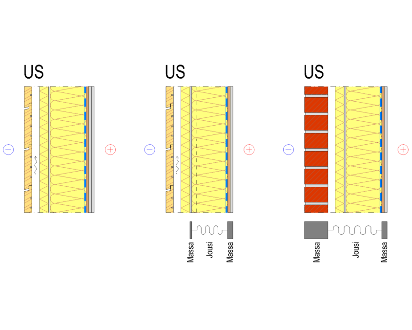 Puurakenteisten rakennusosien ääneneristävyys perustuu ns. jousi-massa-yhdistelmään, jossa on kaksi erillään olevaa massaa (levyt) ja näiden välissä on ilmatila (”ilmajousi”). Tämä johtuu siitä, että puurakenteisissa rakennusosissa ei ole riittävästi massaa ääneneristystä varten. Huoneistojen välisen betonirakenteisen seinän painon tulee olla noin 500 kg/m(paksuus 200 mm), jotta seinällä saavutetaan R’w = 55 dB. Vastaavasti 200 mm paksu massiivipuulevy painaa noin 100 kg/m2, joten massalakiin perustuva äänitekninen suunnittelu  ei tule kysymykseen uurakennuksessa. Toki jousi-massa-yhdistelmässä massan lisäys parantaa rakennusosan ääneneristävyyttä erityisesti matalilla äänentaajuuksilla