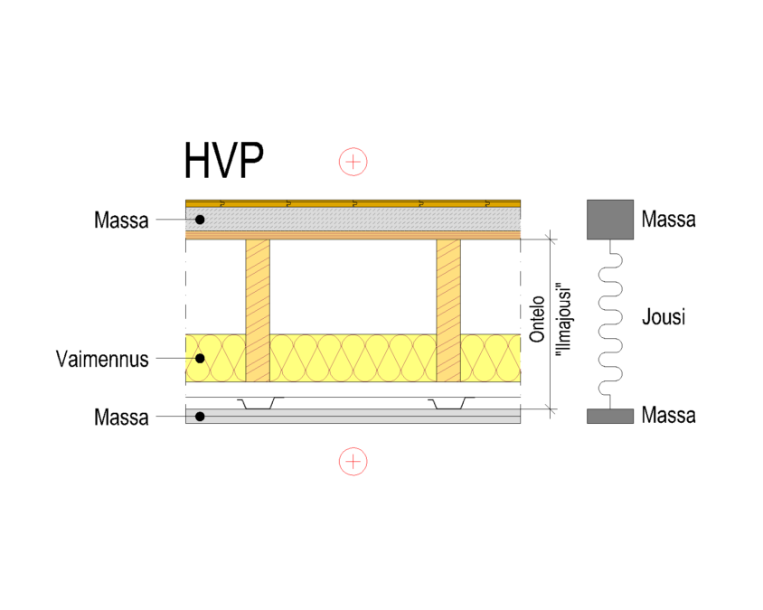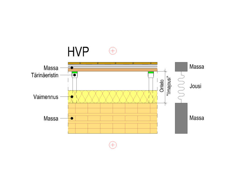 Huoneistojen välisessä välipohjassa (HVP) pätee samat äänitekniset periaatteet kuin edellä mainitussa huoneistojen välisessä seinässä. Välipohjassa levymäiset massat muodostetaan kansirakenteella ja esimerkiksi akustisten jousirankojen varaan asennetulla kipsilevytyksellä.