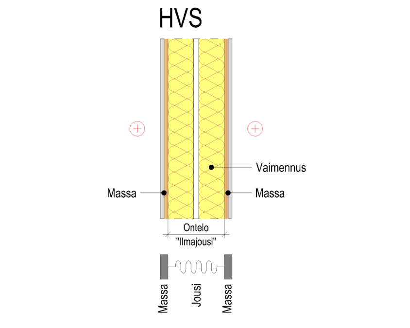 Huoneistojen välisessä seinässä (HVS) levymäiset massat muodostetaan toisistaan erillään olevilla rungoilla. Runkopuoliskojen mekaaninen kytkentä heikentää seinän ääneneristävyyttä radikaalisti. Levymäisten massojen väliin jää ilmatila (”ilmajousi”). Mitä paksumpi ilmatila (ontelo) on sitä parempi on seinän ääneneristävyys. Täyttämällä seinän ontelo pehmeällä vaimennusmateriaalilla (tavallisesti villa), voidaan seinän ääneneristävyyttä parantaa 5…15 dB. Seinän onteloon ei tule asentaa yhtenäistä levytystä, koska levytys katkaisee ”ilmajousen” kahteen osaan. Tämä heikentää seinän ääneneristävyyttä matalilla äänentaajuuksilla.