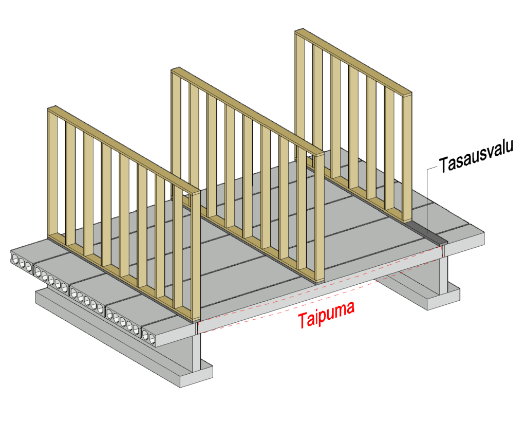 Kaikki kantavat pystyrakenteet tulisi perustaa painumattomille tuille. Kantavia seiniä ei suositella asemoitavaksi esimerkiksi ontelolaataston jänteelle, koska laataston taipuma saattaa aiheuttaa puurunkoon haitallisia pystysuuntaisia muodonmuutoksia. Kyseinen asia tulee tutkia tapauskohtaisesti, koska se on riippuvainen laataston jännevälistä ja seinän kuormituksen suuruudesta.