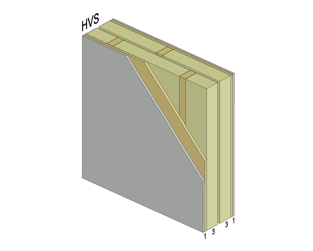 1. Sisäpuolen levytys vaikuttaa erityisesti seinän palo-, ääni- ja jäykistystekniseen toimintaan. Suosituksena on, että seinän sisäpuolella on kaksi levykerrosta päällekkäin. Näistä alimmainen on puulevy, joka suunnitellaan toimimaan jäykistävänä levytyksenä ja kiinnityspintana. Molemmat levykerrokset voidaan suunnitellaan toimimaan palo- ja ääniteknisenä levytyksenä.