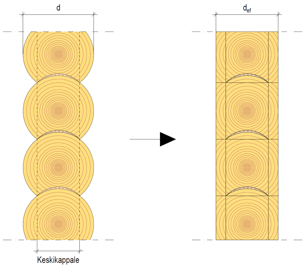 Kuva 1. Pyöröhirsiseinän tehollisen paksuuden määrittämisen periaate.