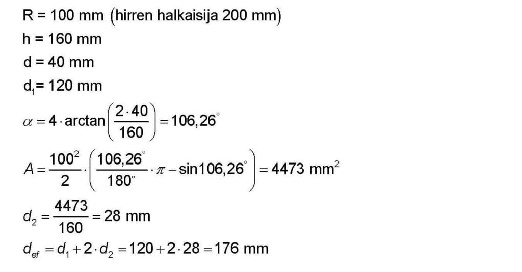 Pyöröhirsiseinän tehollinen paksuus voidaan määrittää kuvan 1 periaatteella. Kyseisessä periaatteessa pyöröhirren keskikappaleen molemmille puolille jäävän ympyräsegmentin poikkileikkauksen pinta-ala muutetaan vastaamaan suorakulmioita.