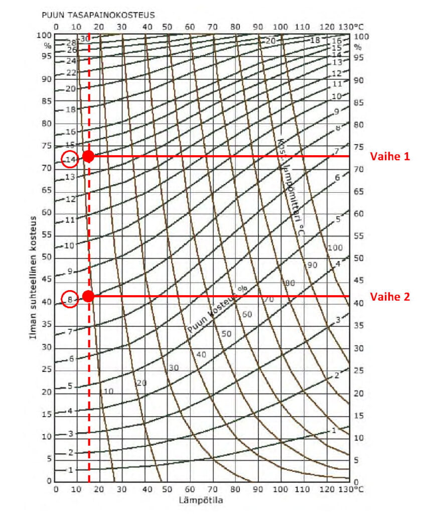 - Olosuhteessa RH 80 % / + 5 °C on puun kosteuspitoisuus noin 17 %