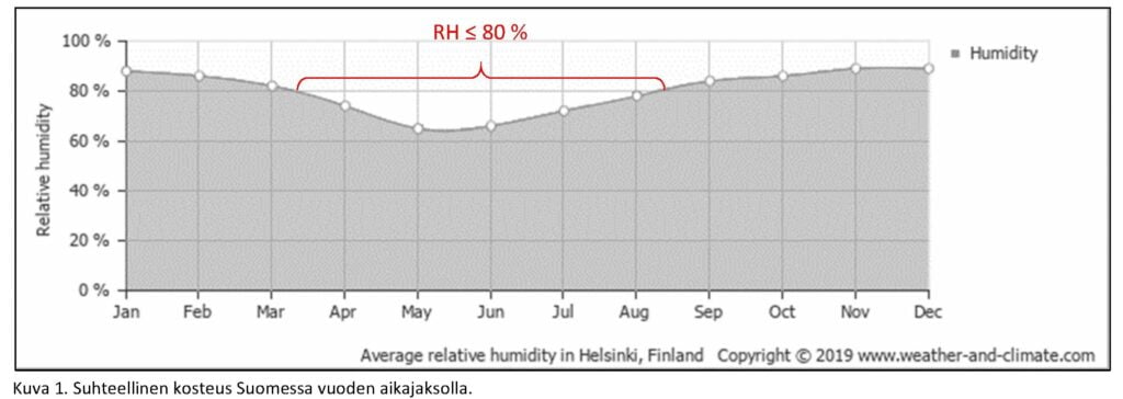 - Olosuhteessa RH 90 % / + 5 °C on puun kosteuspitoisuus noin 22 %