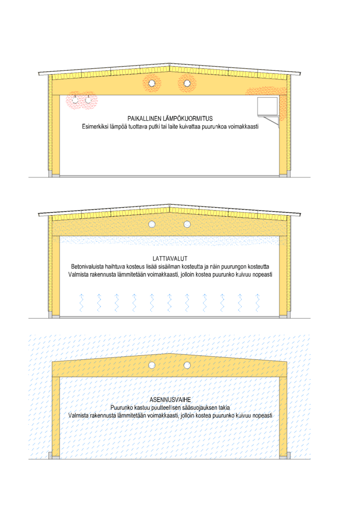Puurakenteen kuivaaminen järjestetään siten, että kuivuminen tapahtuu riittävän hitaasti. Mitä massiivisempi puu-rakenne on, sitä hitaammin se tulee kuivata. Nopea kuivaaminen aiheuttaa halkeilua. Käytännössä liian nopeaa kuivumista voidaan hidastaa esimerkiksi rakennusosien muovisuojauksella. Tässä voidaan hyödyntää esimerkiksi rakennusosien kuljetuksessa käytettäviä suojauksia siten, että ne poistetaan asteittain suunnitelmallisesti. Puurakenteen kuivaaminen toteutetaan vaiheittain siten, että kussakin vaiheessa puurakenteen kuivumistavoite on enintään 6 %. Puurakenteiden kuivaamisessa aikataulujen näkökulmasta tulee muistaa, että kuivuminen vie paljon aikaa.