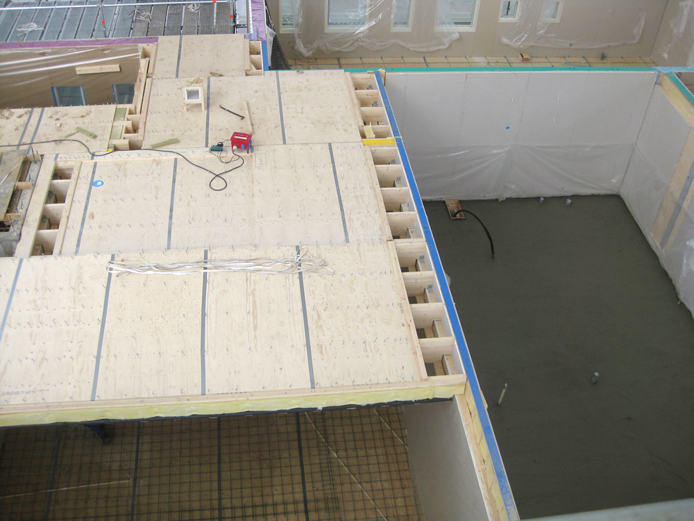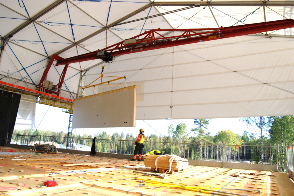 Kuva 13. Kattolohkoista koostuva työnaikainen suojakatto suurelementtitalon päällä.